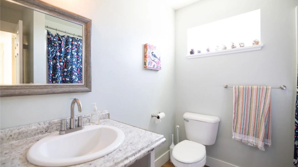 Soft natural light filters through a high-set window to illuminate this sweet bathroom. A modern white vanity with a marbled countertop adds a sleek and clean look, while a rustic wooden-framed mirror warms the space. Splashes of color come from the bright floral shower curtain and a colorful towel, adding a playful and inviting atmosphere to the space. A small bird-themed piece of artwork adds whimsy to the soft-colored walls. The pinecones lining the narrow shelf above the toilet introduce a touch of nature into the space. Each element, from the elegant yet understated fixtures to the warm textures, creates a sense of style and welcome in this bathroom.