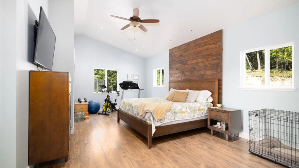 Combining comfort and functionality, this light-filled bedroom is a tranquil retreat with a contemporary twist. The wooden accent wall in reclaimed wood behind the bed provides a touch of warmth, complementing the pale blue walls perfectly. Large windows flood the room with sunlight, infusing the air with freshness and welcoming ambiance. A workout zone, equipped with a treadmill and stationary bike, adds functionality to the space without sacrificing style. The hardwood floor adds to the comfortable but modern ambiance, and the understated decor and neutral color scheme maintain the space’s balance. Each element helps create a seamless combination of relaxation and work.
