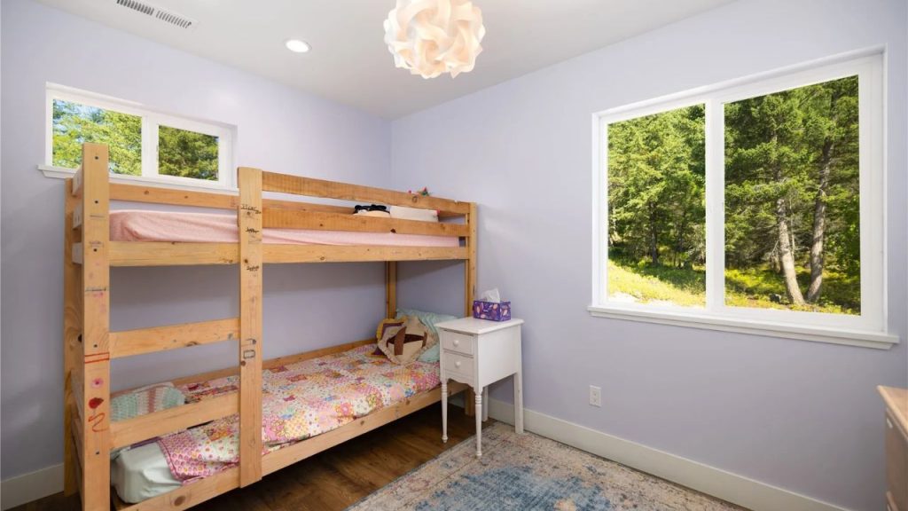 Soft lavender walls and wooden accents provide a sense of natural warmth in this bunk bedroom. The wooden bunk bed, handcrafted with rustic simplicity, is accompanied by colorful bedding that brings a sense of warmth and personality to the space. Large windows encapsulate a rich, green exterior view, flooding the space with lots of natural light to illuminate the room. A plain white nightstand is placed conveniently next to the bed, providing exactly the right degree of utility. The plush area rug at your feet provides additional comfort, making this the ideal room for sleep-filled nights and sunny mornings.