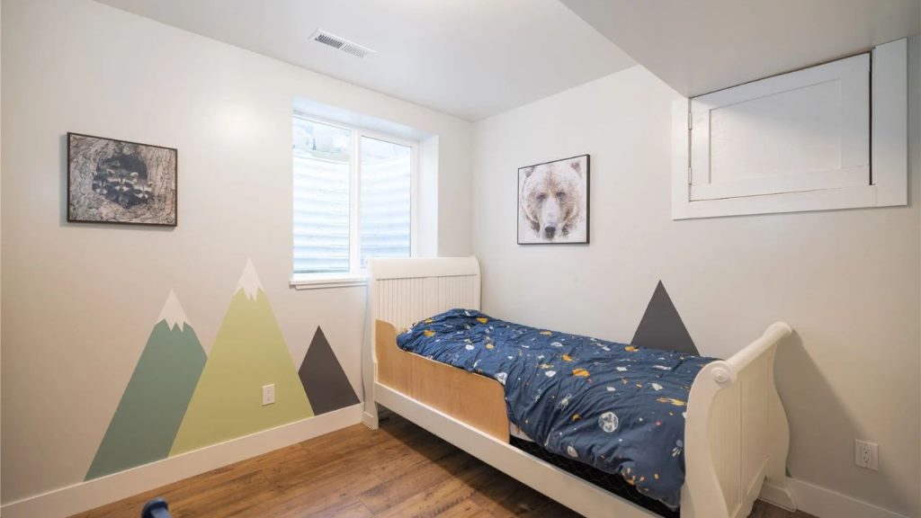 Soft mountain murals and wildlife paintings add a sense of adventurous whimsy to this warm bedroom. The white sleigh bed, combined with a dark blue space-themed comforter, creates a playful contrast to the natural hues of the room. A tiny window admits natural light, illuminating the light-colored walls and wood floor. The bear painting and raccoon-themed artwork add to the outdoorsy theme, creating a sense of seclusion in this little woodland sanctuary. Thoughtful details like the built-in storage door add character while keeping the room functional and inviting.