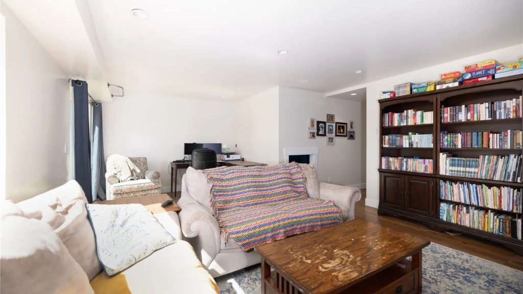 Natural light floods this warm living space, filling the room with a cheerful and inviting glow. A tall bookshelf, stacked with a vast library of books and board games, brings a touch of whimsy and personality to the room. Soft seating, covered in vibrant blankets, beckons relaxation, and a wooden coffee table with a rustic finish occupies the center, bringing warmth and character. A small working space tucked into the corner maintains functionality without overwhelming the room. Framed photos of the family and a simple fireplace contribute further to the warm, cozy atmosphere, and this is the ideal place to relax.