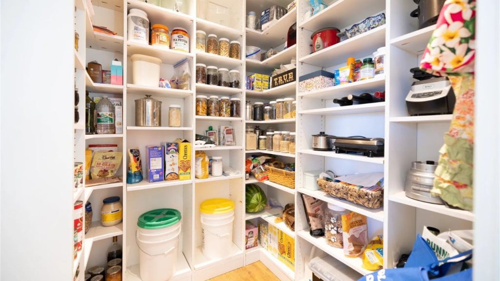 Stepping into this spacious pantry, you’re greeted by neatly arranged shelves stocked with essentials. Clear jars filled with grains, nuts, and dried goods add a touch of organization, making ingredients easy to find. Large storage bins on the lower shelves keep bulk items tucked away, while small appliances have their dedicated space on the side. Wicker baskets store snacks and household items, bringing a touch of country to the utilitarian design. A few cookbooks and some bottles of wine suggest a home where good food and careful preparation are important. With everything in order, this pantry is both efficient and welcoming.