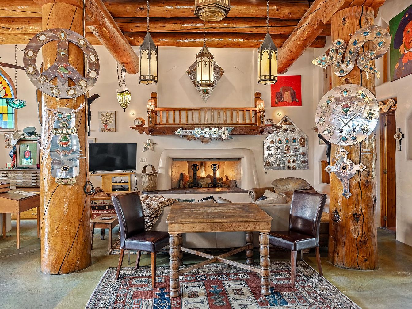 This living room features a rustic Southwestern design, showcasing thick wooden log beams and sturdy columns adorned with metal art. The centerpiece is a kiva-style plaster fireplace with a wooden mantel, adding warmth and a welcoming feel for families. Earthy tones dominate the space, with tan sofas and a richly patterned area rug providing cozy comfort. Leather chairs flank a weathered wooden table, suitable for family games or meals. Unique pendant and lantern lights hang from the ceiling, illuminating the open-plan room. Colorful artwork, playful decorations, and a stained-glass window create a vibrant yet inviting atmosphere perfect for all ages.