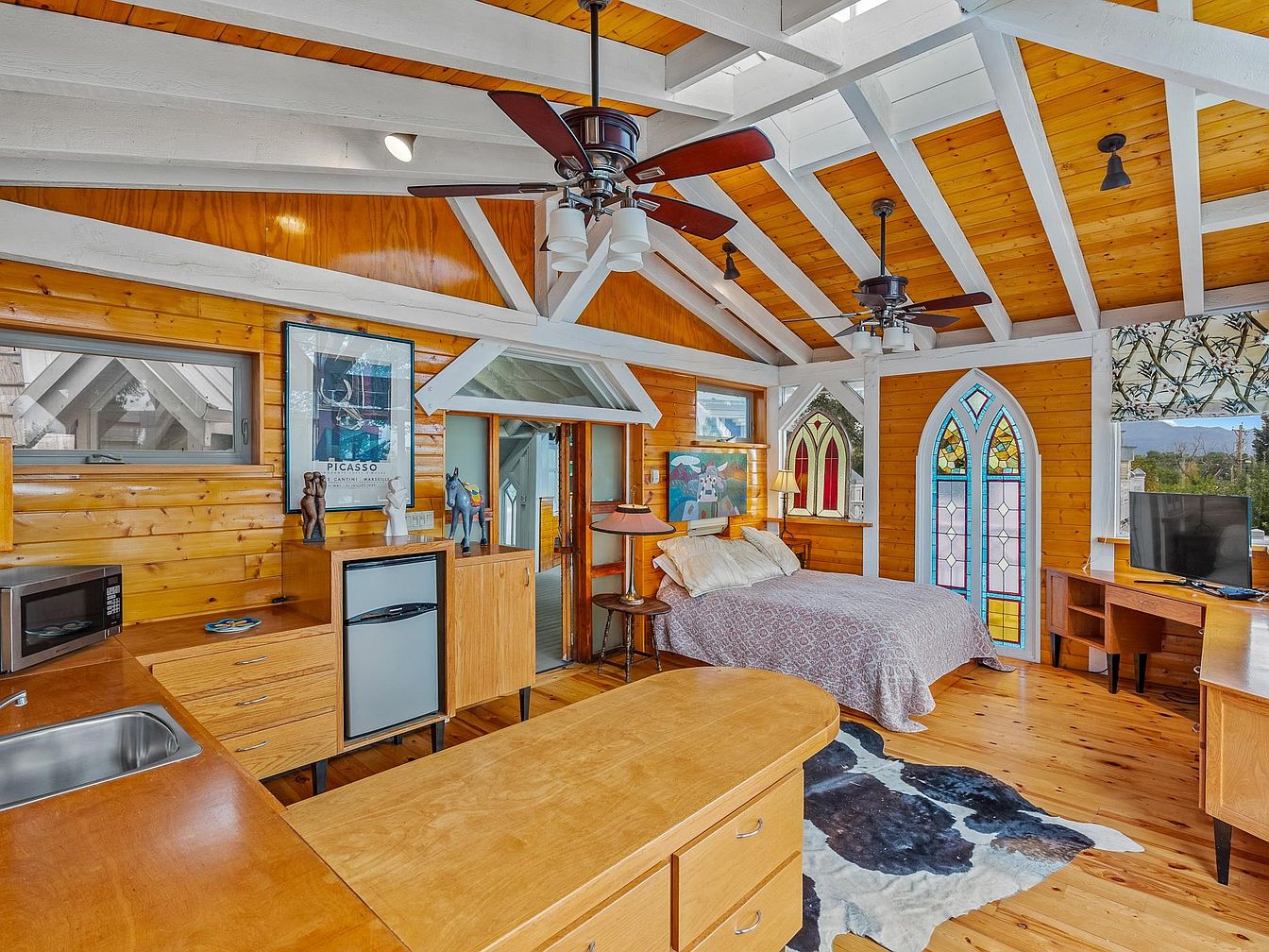 Warm wooden walls and flooring, paired with white painted beams and high vaulted ceilings, create a cozy and inviting bedroom retreat. The room features a queen-size bed with a soft patterned quilt, ample natural light from multiple windows, and striking cathedral-style stained glass accents that add a unique, colorful focal point. Family-friendly details include broad spaces for play or movement, plentiful built-in storage with dressers and shelving, and a work-ready desk area. A kitchenette with a sink, mini fridge, and microwave offers convenient meal prep for families. Double ceiling fans ensure year-round comfort in this welcoming, open layout.