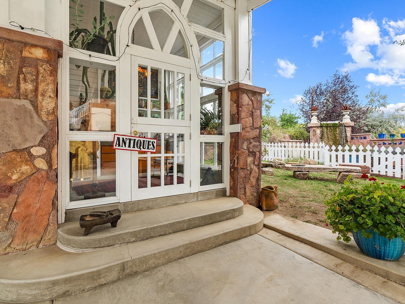 A welcoming front entryway features a wide, gently curving concrete porch with two steps, making it easily accessible for all ages. The entrance is framed by rustic stone walls on either side, contrasting elegantly with crisp white wood trim and a large, glass-panelled double door highlighted by geometric and arched accents. A sign reading “ANTIQUES” adds character and hints at the home’s charm. Lush greenery in a bright blue planter, a weathered clay pot, and a glimpse of a well-kept white picket fence in the yard contribute to the inviting, family-friendly, and picturesque atmosphere, perfect for gatherings and play.