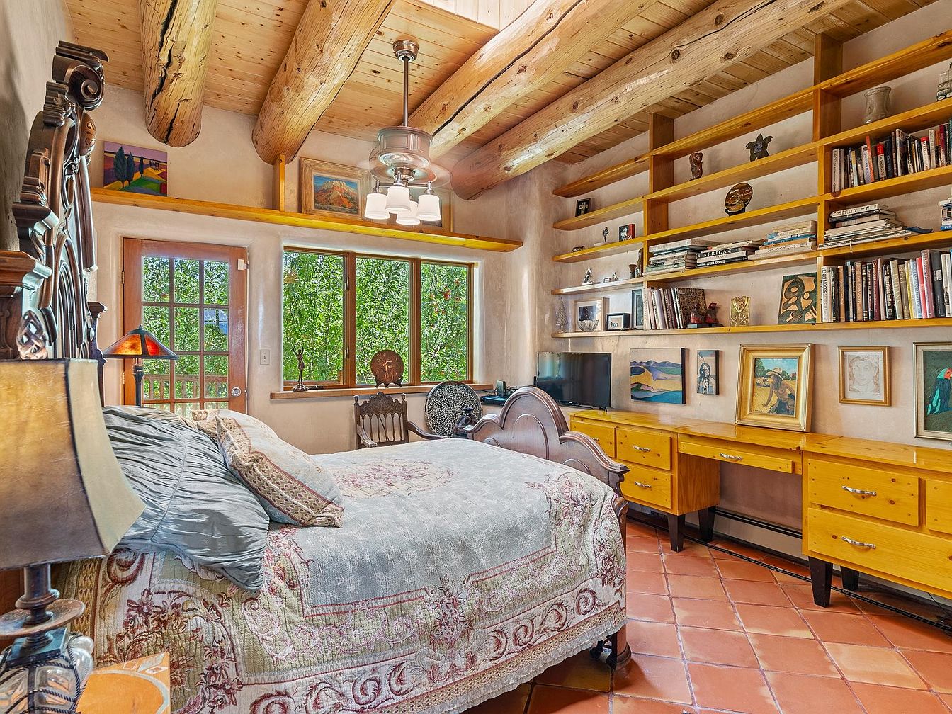 Cozy bedroom that features rustic wooden ceiling beams and warm terracotta tile flooring, creating a homely and welcoming ambiance. A large bed with an ornate headboard is complemented by soft, pastel bedding for comfort. The space is filled with natural light, thanks to expansive windows and a glass door offering lovely outdoor views, perfect for a family setting. Built-in wooden bookshelves and a roomy desk create a practical study area, ideal for kids’ homework or home office needs. Earth-toned finishes, eclectic art, books, and natural textures combine for a harmonious, inviting, family-friendly retreat.