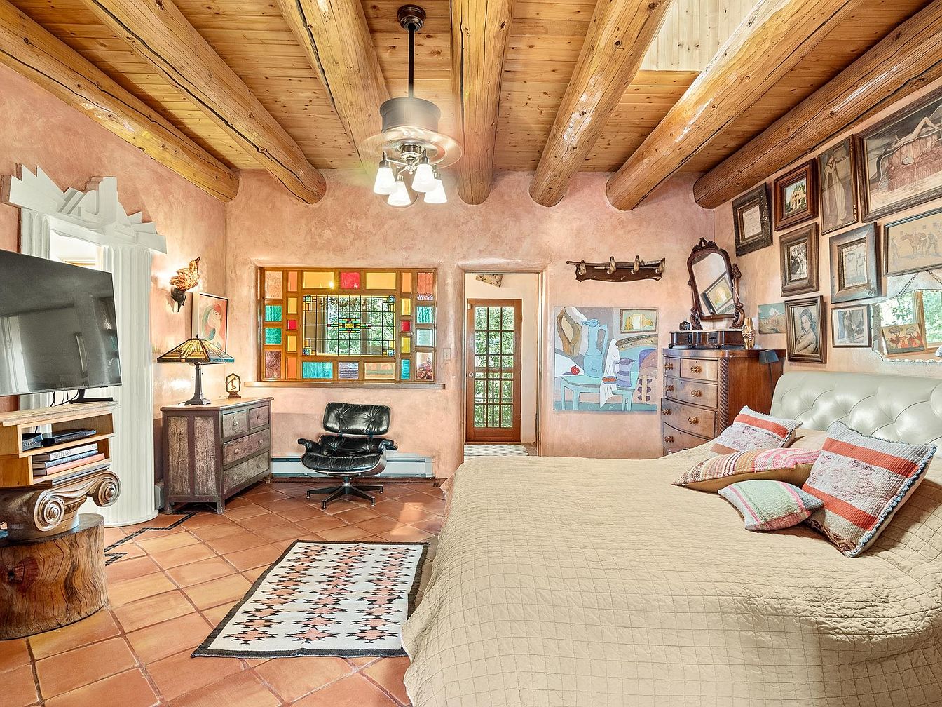 Warm and welcoming master bedroom featuring rustic exposed wooden beams across the ceiling, paired with textured terracotta tile flooring for a cozy Southwestern feel. The walls are painted a soft, earthy peach, enhancing the room’s airy and light-filled ambiance. Large stained glass windows with rich reds, blues, and yellows allow colorful natural light to filter in. Family-friendly details include ample space, plush upholstered headboard, and several soft, patterned pillows on the bed. The room includes a reading nook with a comfortable black leather armchair, multiple dressers for storage, and a decorative rug, complemented by thoughtful original art, adding comfort and personality.