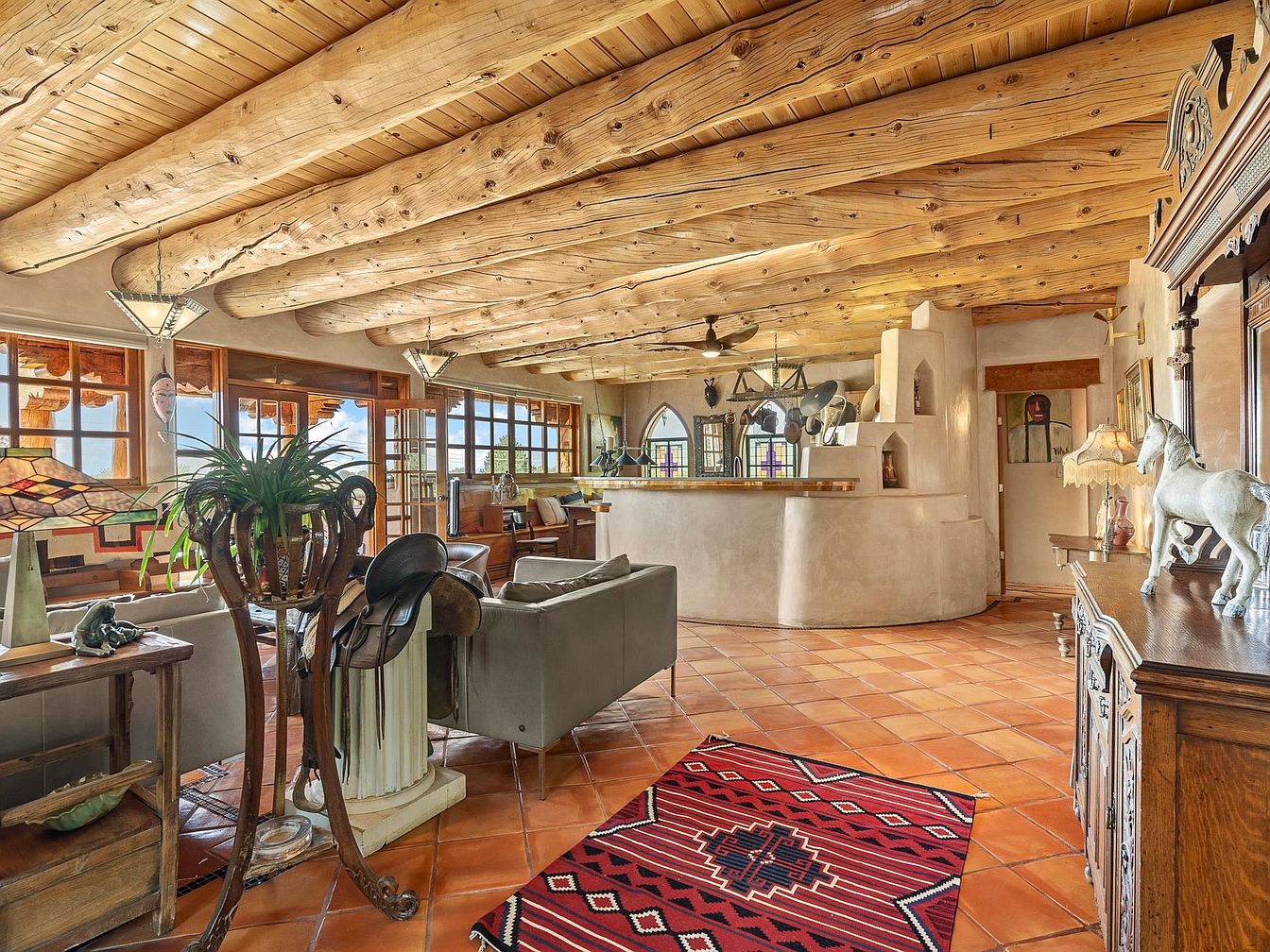 Spacious living area features a warm Southwestern style with exposed timber beams across the ceiling and angled sunlight from broad wooden-framed windows. Terra cotta tiles in earthy orange and tan tones cover the floor, highlighted by a geometric red and black patterned rug. The seating area includes plush, neutral-toned sofas arranged for conversation, making it an inviting space for family gatherings. Handcrafted wooden furniture, southwestern art, and decorative horse sculptures line the edges, while potted greenery adds charm. An open, curved adobe bar and kiva fireplace at the far corner offer cozy comfort and a focal point. Child-friendly open spaces and abundant natural light create a welcoming and safe environment for all ages.