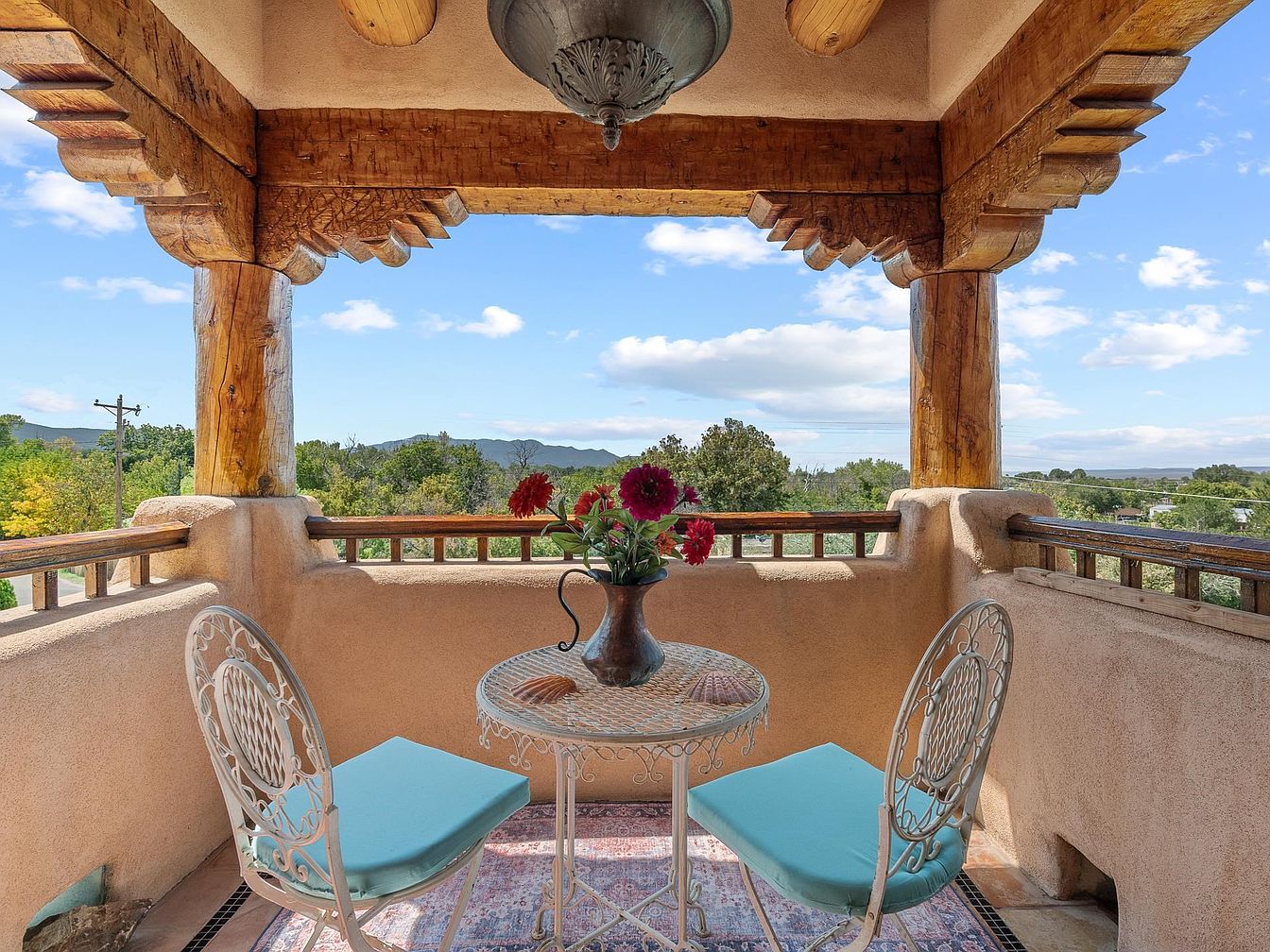 A cozy covered patio features traditional Southwestern design with sturdy wooden beams and textured stucco walls. Two decorative wrought iron chairs with pale turquoise cushions are paired with a small, round iron table, topped with a rustic metal vase filled with bright red flowers, creating a welcoming spot for relaxation or conversation. The patio is set on a soft patterned rug providing comfort underfoot and warmth to the space. Open railings border the area, ensuring safety for families while allowing an uninterrupted view of lush green trees, distant hills, and an expansive sky. Perfect for outdoor family breakfasts or evening gatherings.