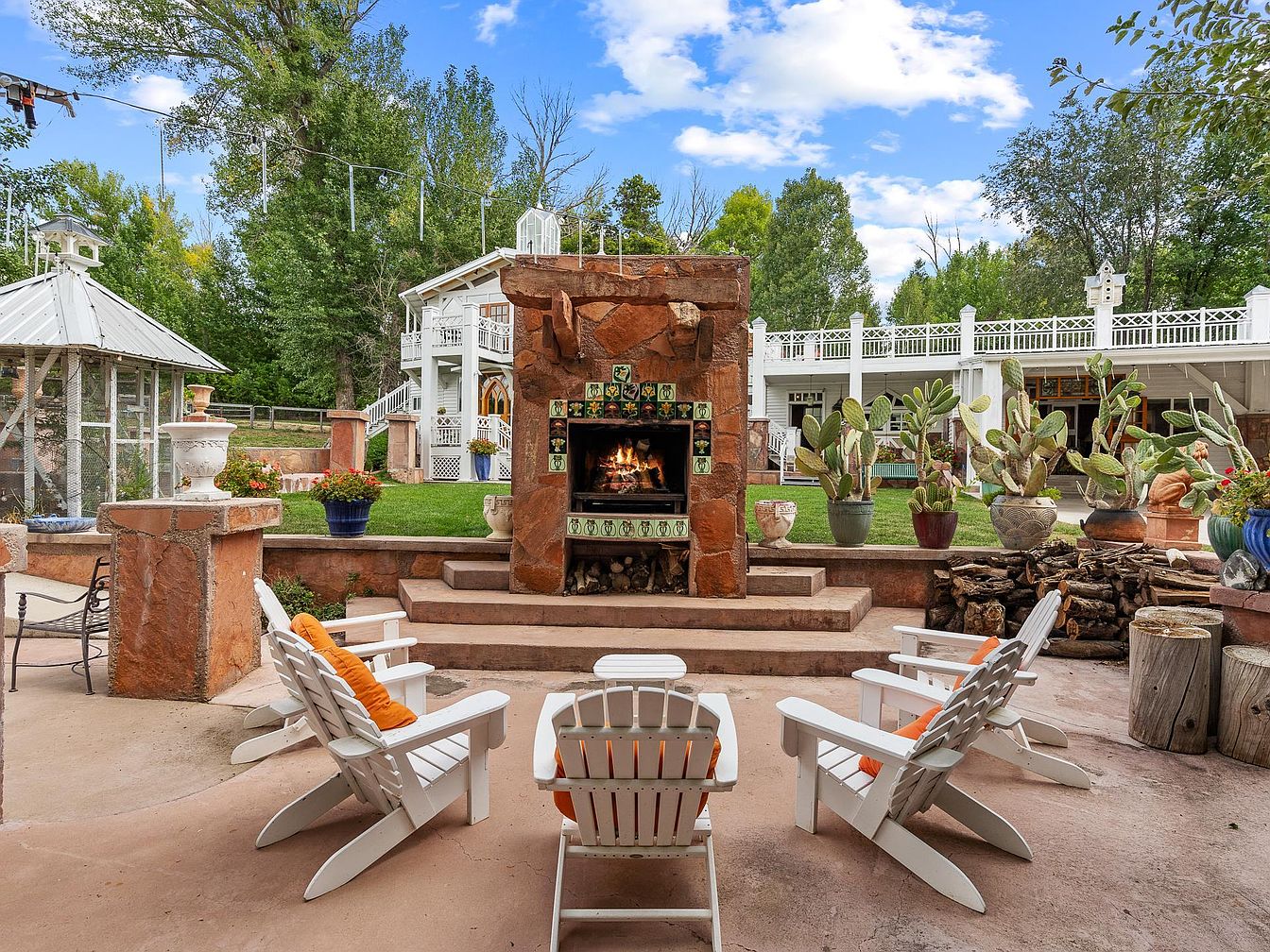 A spacious, inviting outdoor patio area centers around a large rustic stone fireplace, perfect for family gatherings or entertaining guests. Four white Adirondack chairs with bright orange cushions create a cozy seating circle, ideal for relaxing together. Potted cacti and colorful flowers line the patio’s borders, adding green accents and Southwest charm. The surrounding architecture includes a classic white gazebo and a two-story white veranda, both offering shaded spots for children to play or adults to unwind. The natural stone, wood finishes, and lush lawn offer a relaxed, resort-like atmosphere that encourages outdoor living and shared moments.