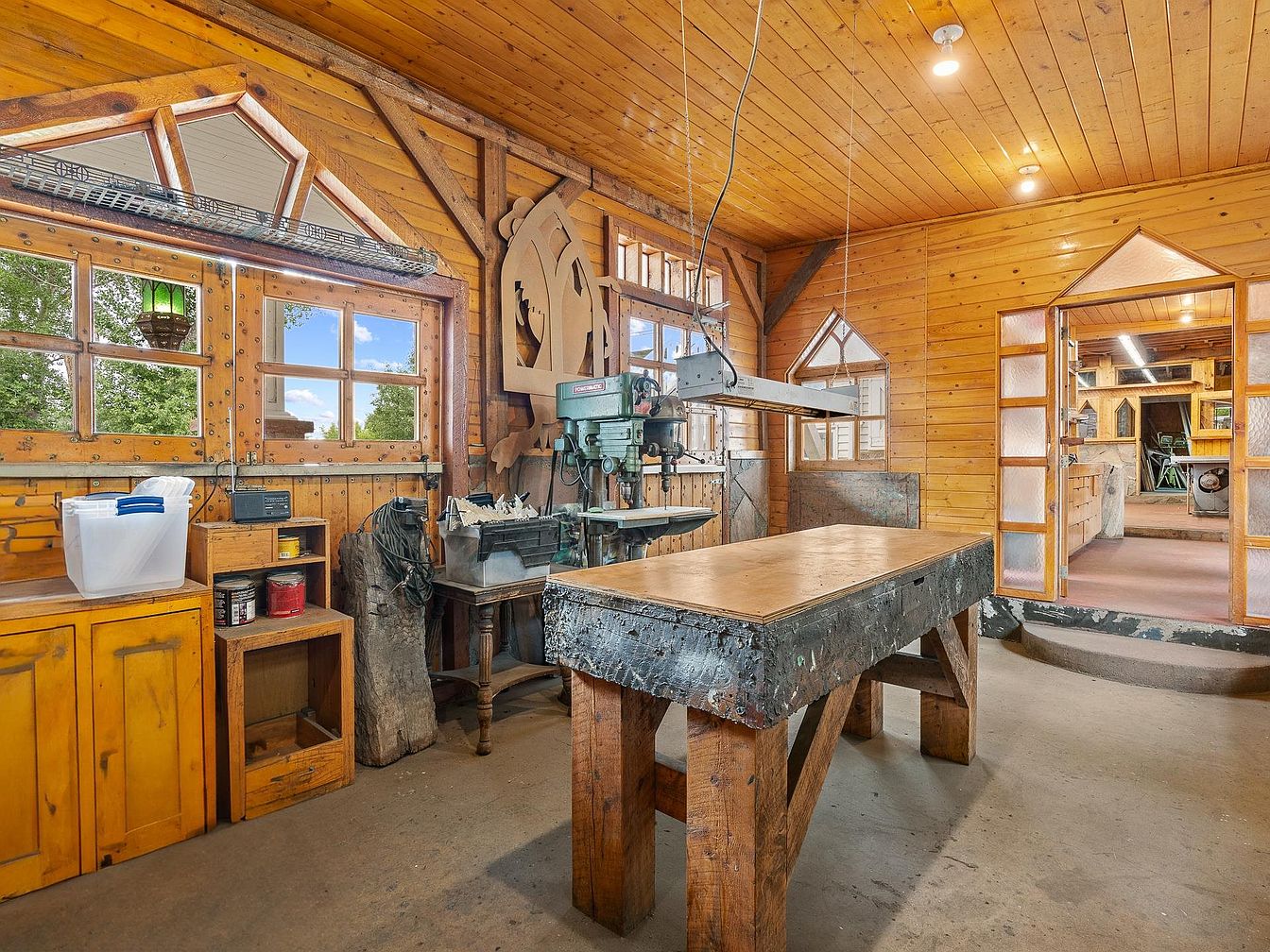 Warm, honey-toned wood paneling covers the walls, ceiling, and cabinetry of this spacious workshop, giving it a welcoming, rustic charm perfect for family projects or creative hobbies. The room features large, paneled windows that let in natural light and offer views of lush greenery outside. A heavy-duty wooden workbench dominates the center, paired with sturdy cabinets for organized storage. The open layout connects to another room through beautiful wood-framed glass doors, providing easy access and visibility for supervising children as they work alongside adults. Industrial tools and materials are neatly arranged, reflecting both functionality and family-friendly accessibility.
