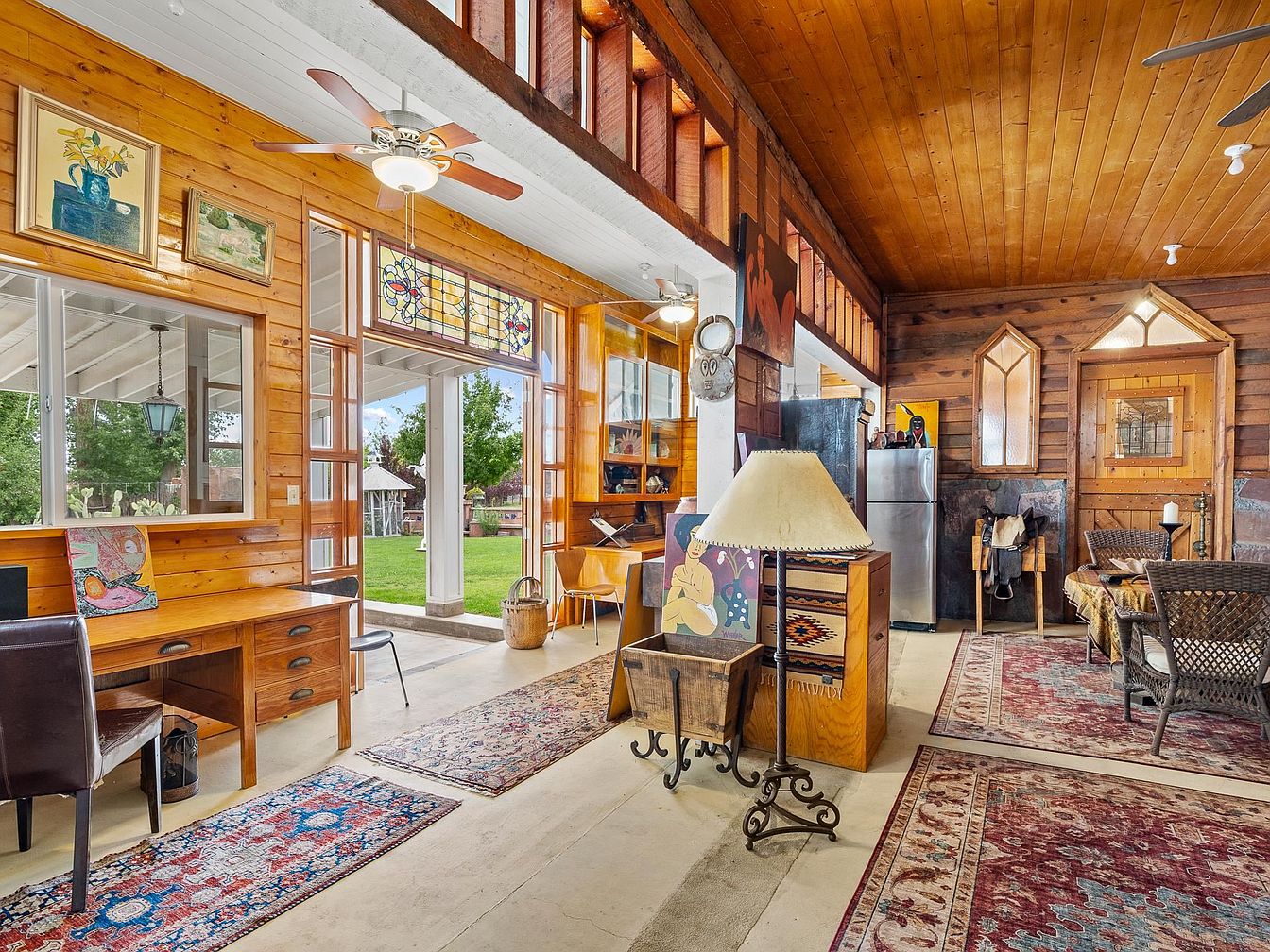 A spacious, open-concept living area with abundant natural light pours through large windows and glass doors leading to a lush backyard, creating a seamless indoor-outdoor flow perfect for families. The room features warm, honey-toned wooden walls and ceilings that offer a cozy, inviting atmosphere. Vibrant rugs with intricate patterns line the concrete flooring, adding comfort and color. Distinctive stained glass highlights the entryway, while family-friendly furniture, such as a writing desk, cozy armchairs, and a sturdy dining table, invites relaxation, homework, or crafts. Artistic framed prints, decorative lamps, and unique architectural accents, like arched windows and built-in shelving, show off charming character throughout.
