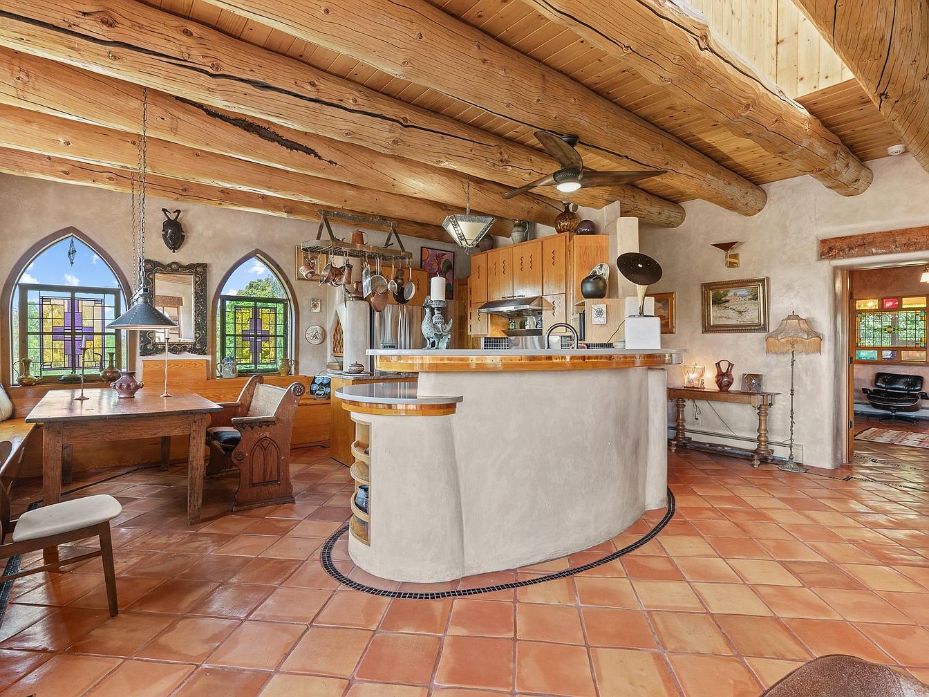 A warm and inviting open-concept kitchen and dining area features rustic terracotta tile flooring and exposed wooden ceiling beams that add a cozy, natural charm. The rounded kitchen island with a built-in shelf and smooth wooden countertop invites family gatherings and social cooking. Arched stained-glass windows offer colorful light and enchanting views, while a built-in breakfast nook with a sturdy wooden table and benches creates a perfect space for family meals. Custom wood cabinetry and hanging pot racks provide ample storage. The earth-toned palette and artful décor, including vintage wall pieces and soft lighting, create a welcoming, family-friendly atmosphere.