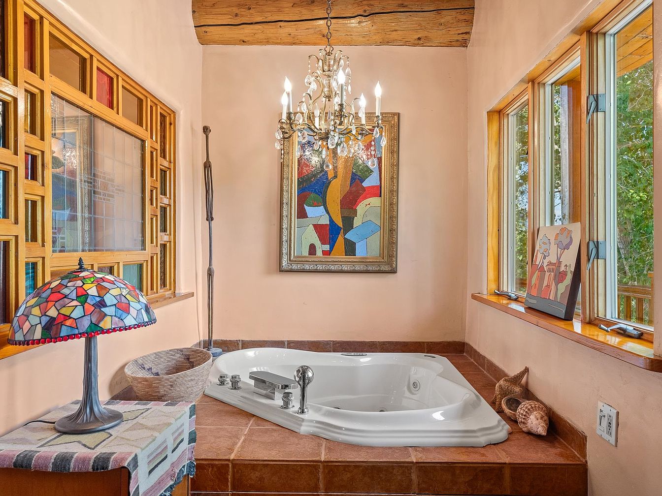 A cozy bathroom corner featuring a built-in white soaking tub set on warm terracotta tiles, surrounded by soft peach walls. Natural light streams in through three large windows framed with honey-colored wood, providing a tranquil view of greenery and creating a soothing environment. A sparkling crystal chandelier hangs overhead, adding elegance to the space. Family-friendly touches include a sturdy tub ledge perfect for safe entry and bath time with children. Decorative elements, such as a colorful mosaic Tiffany-style lamp, woven basket, and two pieces of abstract artwork, enhance the inviting, artistic character and warmth of the room.