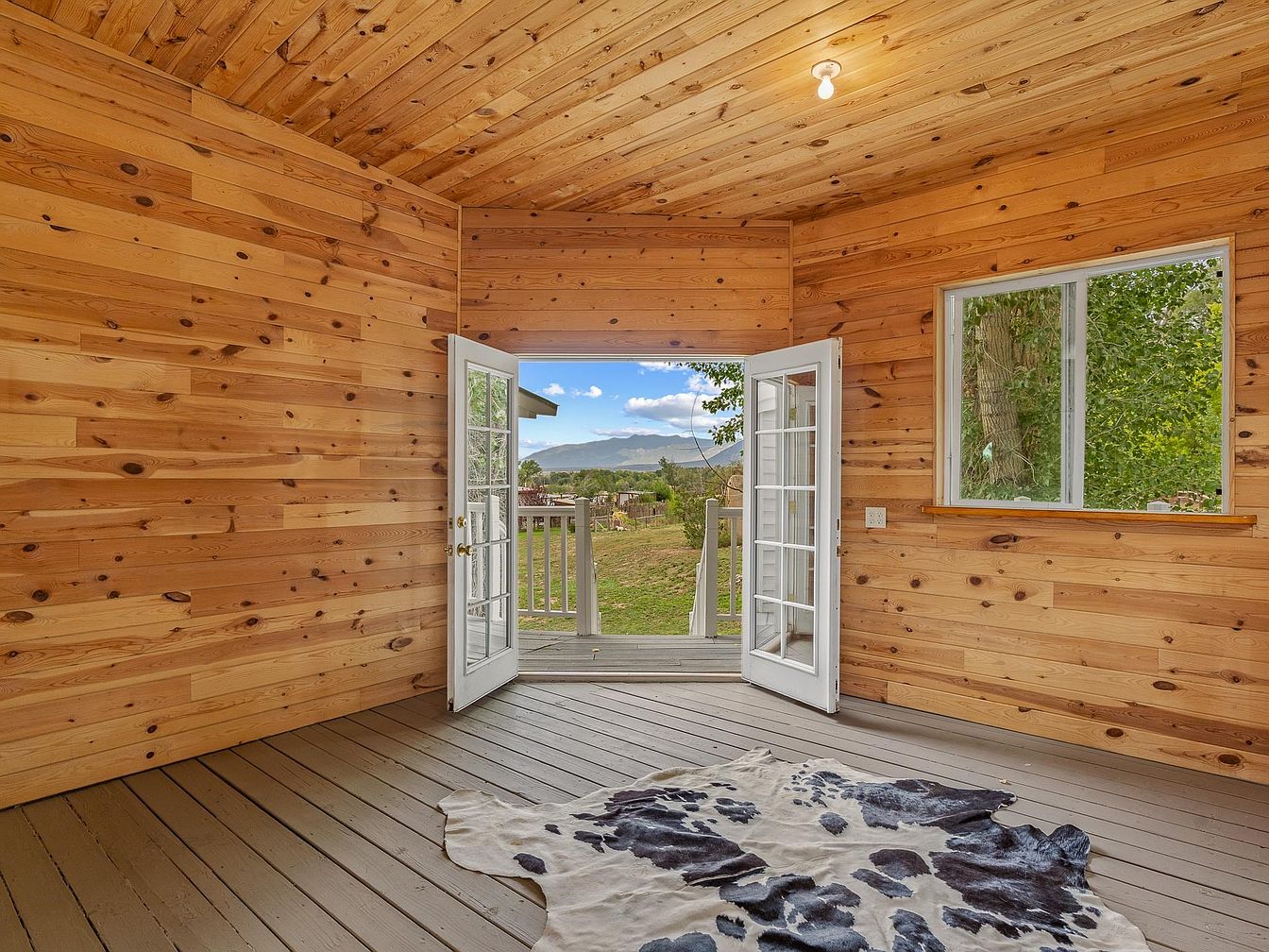 A spacious sunroom with warm, honey-toned natural wood walls and ceiling creates a cozy, inviting atmosphere ideal for family gatherings. French doors with glass panels open outward to a lush backyard, letting in plenty of natural light and offering easy access to the outdoors, perfect for children to play safely. A large picture window frames verdant trees, bringing nature inside. The room features rustic gray wood plank flooring and a black and white cowhide rug adding comfort and style. Simple lighting overhead keeps the space bright, making it suitable for reading, relaxing, or entertaining family and friends.