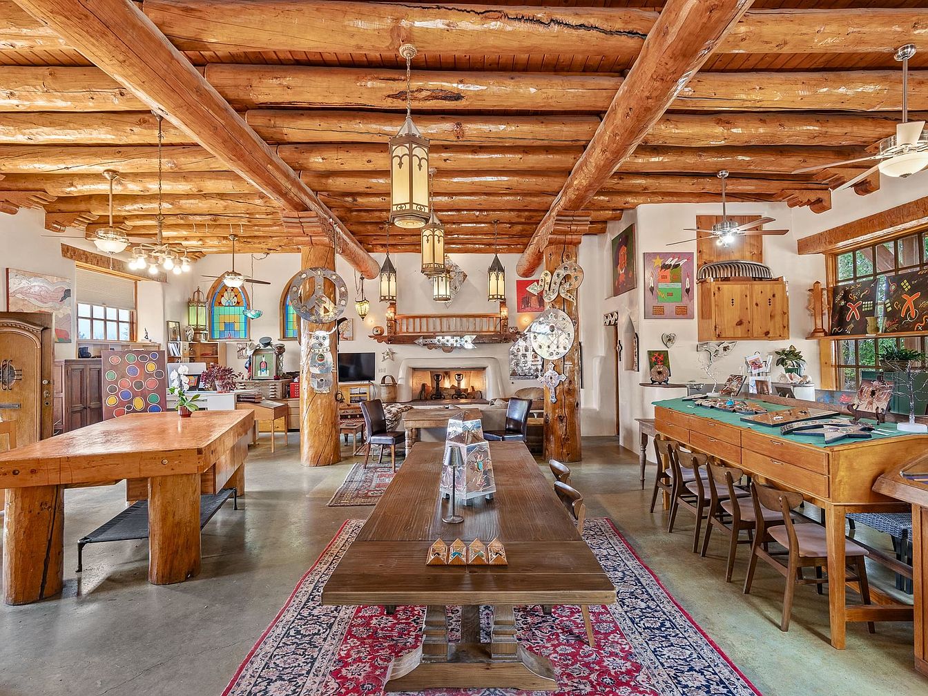 Spacious open-plan room with stunning rustic beams overhead, large windows letting in plenty of light, and a cozy adobe-style fireplace as a central feature. Earthy wooden furniture, including long dining tables and benches, occupy much of the space, ideal for big family meals or creative group activities. Colorful stained glass windows, vibrant area rugs, and eclectic decorations infuse the room with character and warmth. The polished concrete floors are practical for kids and easy maintenance. Ample seating, multiple tables, and inviting art displays foster a relaxed, communal atmosphere perfect for family bonding, play, and shared experiences.