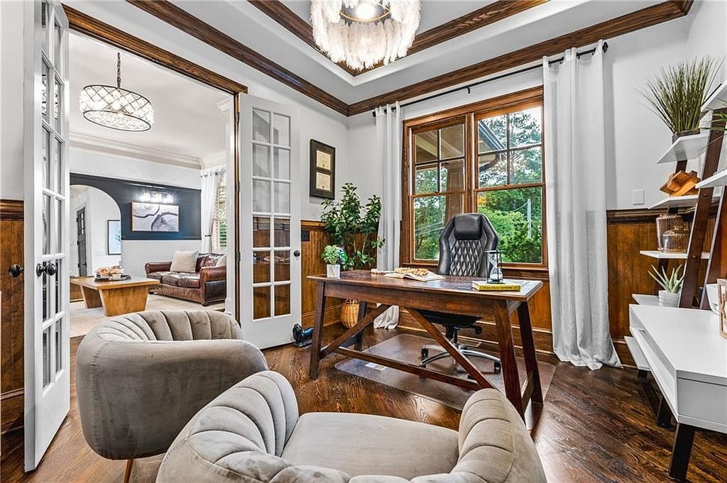 This thoughtfully designed home office features a warm and inviting atmosphere with dark wood detailing on the floors, window frames, and coffered ceiling. The natural light floods in through a large window dressed with soft white curtains, enhancing the warmth of the space. A wooden desk with a rich finish stands prominently, paired with a modern ergonomic office chair. Plush, rounded beige chairs offer additional seating, creating a cozy yet professional feel. Decorative greenery and a shelving unit with carefully placed accessories add personality and balance, while French doors open to a comfortable adjoining living area.