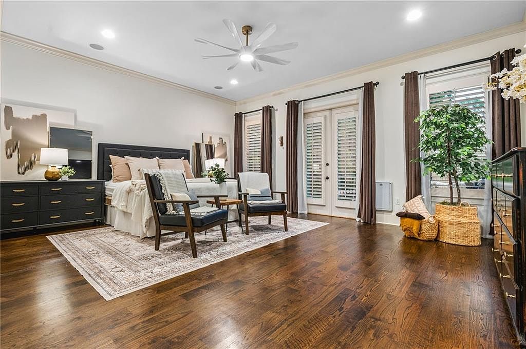 The master bedroom features a serene and inviting layout with a large bed centered against the wall, complemented by two upholstered chairs and a small wooden table at the foot, creating a cozy sitting area. The floor boasts rich, dark hardwood that adds warmth to the space, while the walls are painted in a crisp white, enhancing the room’s brightness. Dark curtains frame two sets of French doors and side windows fitted with plantation shutters, allowing natural light control. Accents include modern table lamps, abstract art pieces, and potted greenery to bring life to the contemporary yet comfortable aesthetic.