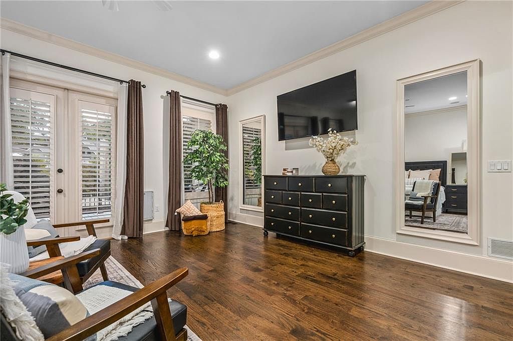 This peaceful sitting area features warm, rich hardwood flooring that complements the creamy white walls and crown molding. Two armchairs with wooden frames and neutral cushions face inward, creating a cozy spot for conversation or relaxation. The space is brightened by natural light filtering through tall French doors and windows outfitted with plantation shutters and flanked by elegant floor-to-ceiling curtains in a taupe shade. A sleek black dresser with golden knobs anchors the wall beneath a mounted flat-screen TV, balanced visually by two large mirrors that add depth and reflect light, enhancing the room’s airy feel. A potted plant and woven basket add natural textures, completing this inviting, transitional aesthetic.