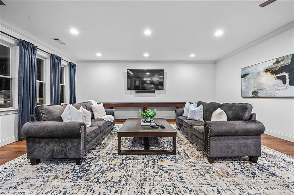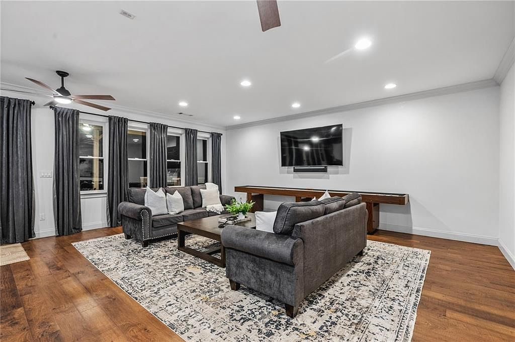 This spacious living room features a sleek, modern design highlighted by a clean white ceiling and walls that amplify the brightness from multiple recessed lights. A rich hardwood floor grounds the space, complementing the dark grey upholstered sofas arranged around a simple wooden coffee table. A large area rug with a subdued patterned design adds texture and warmth beneath the seating cluster. Floor-to-ceiling windows dressed in charcoal grey curtains allow natural light during the day. A flat-screen TV is mounted on the wall above a narrow wooden console, creating a minimalist entertainment zone. A ceiling fan with wooden blades blends subtly into the neutral palette, ensuring comfort while maintaining the room’s contemporary aesthetic.