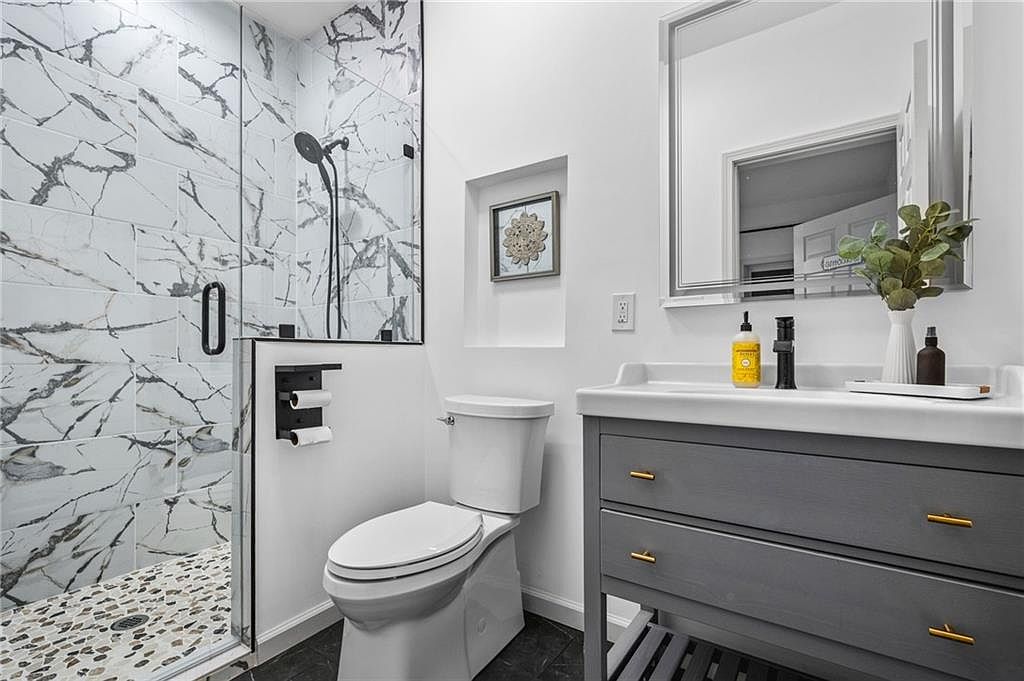 This bathroom combines modern elegance with functional design. A sleek glass-enclosed shower features white marble tiles with bold gray veining, adding a luxurious and timeless feel. The shower floor is detailed with a pebble-style mosaic, introducing texture and natural elements. A white toilet with a paper holder mounted on the partial wall keeps the space organized, while a dark gray vanity with gold-tone hardware provides subtle contrast and warmth. Atop the vanity, a white countertop supports minimalist accessories, a vase with greenery, and a framed mirror above, enhancing brightness and a fresh, clean atmosphere.