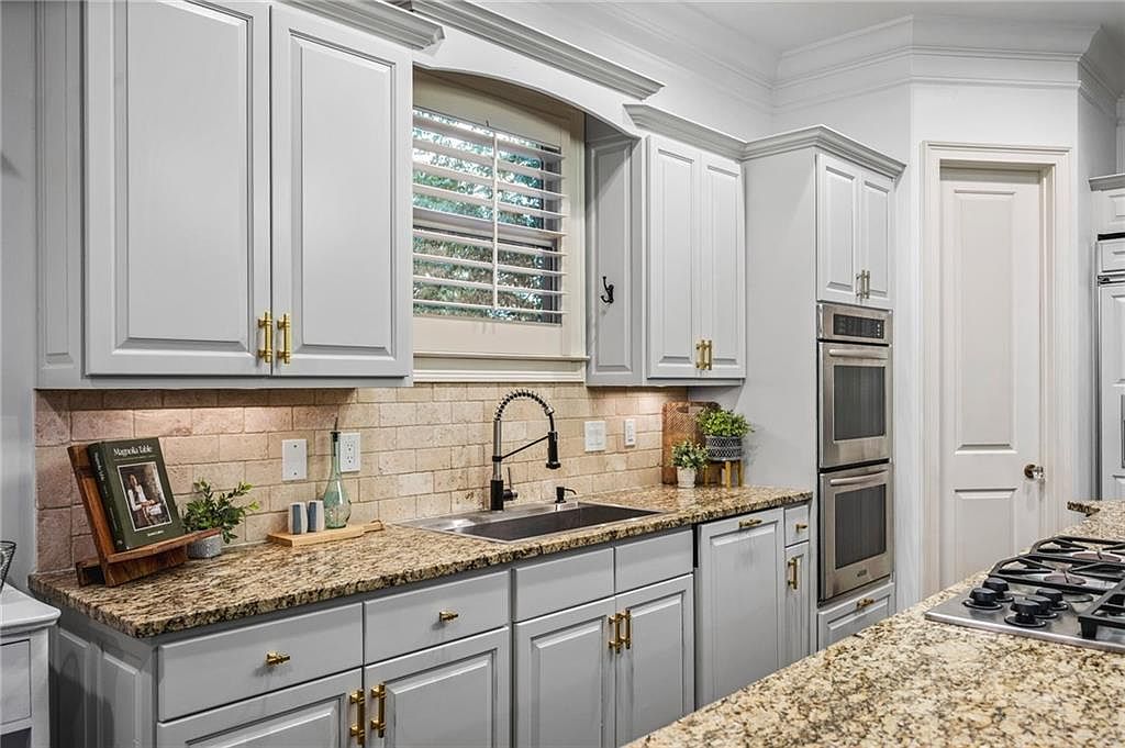 This kitchen section highlights a sleek, functional countertop space adorned with a speckled granite surface in earth tones, complemented by a beige tiled backsplash featuring a subtle, natural stone texture. Soft gray cabinetry with clean, paneled doors and brass hardware adds warmth and elegance. A single under-mounted stainless steel sink is centered beneath a window fitted with plantation shutters, allowing natural light to brighten the area. To the right, built-in double ovens offer modern convenience, while small potted plants and tasteful kitchen accessories provide an inviting, lived-in feel. The overall design balances traditional and contemporary elements, emphasizing practicality and refined style.