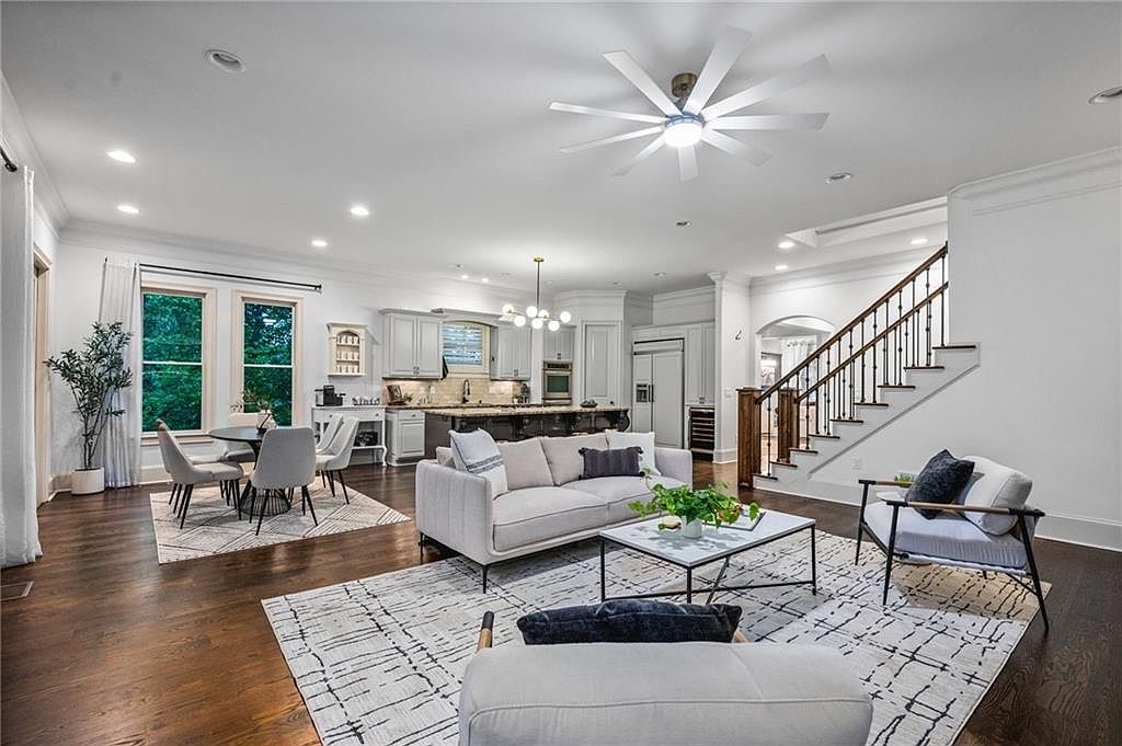 This bright, open space seamlessly integrates the living room, dining area, and kitchen, creating a cohesive flow. The living room features a neutral-toned sofa and armchairs set atop a patterned light rug, complemented by a sleek, modern coffee table with a green plant centerpiece. Across the room, a dark hardwood floor contrasts beautifully with the white walls, cabinetry, and trim, lending a crisp, clean look. The dining area hosts a round table surrounded by upholstered chairs, illuminated by natural light from large windows framed with sheer curtains. Contemporary lighting fixtures and a ceiling fan add stylish functionality. A staircase with wooden banisters provides architectural interest.