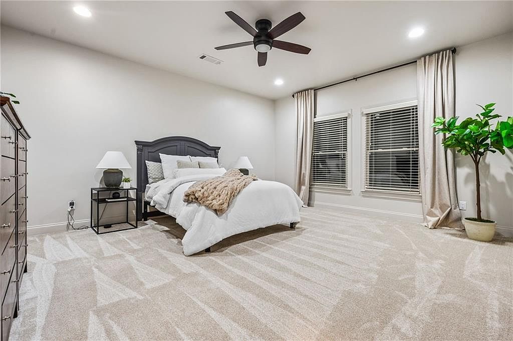 This spacious master bedroom features a calming, neutral palette with light beige carpeting and soft off-white walls, creating a tranquil atmosphere. The room is anchored by a dark wooden bed frame with an elegant headboard, dressed in crisp white bedding and layered with cozy textured throw blankets. Matching bedside tables with modern lamps flank the bed, adding balance and functionality. Two large windows dressed with cream curtains allow natural light to filter in during the day. A tall potted plant in the corner adds a touch of greenery, while a ceiling fan with dark blades complements the understated decor. The overall layout is open and uncluttered, emphasizing comfort and simplicity.