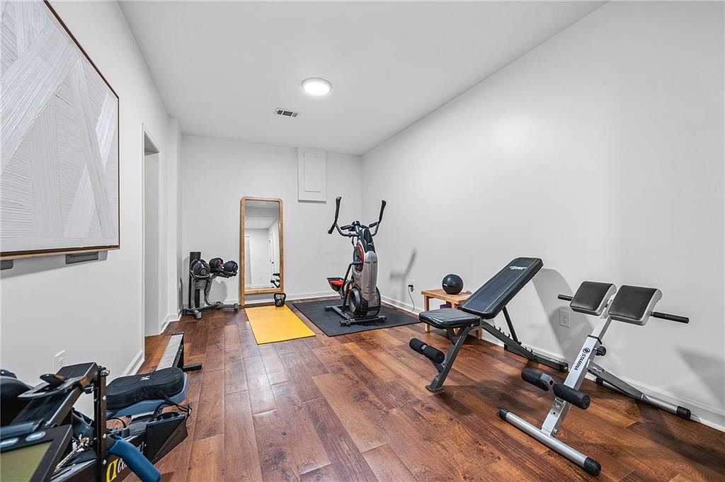 This dedicated workout space features warm, medium-tone wooden floors that add a natural element to the otherwise minimalist white walls and ceiling. The layout is functional, with an exercise bike centered on a black mat alongside a yellow yoga mat providing a dedicated area for stretching or floor exercises. A full-length mirror with a wooden frame stands at the end of the room, enhancing the sense of space and light. The room also includes a weight bench and adjustable dumbbells resting on a small rack, combining practicality with clean, uncluttered design.