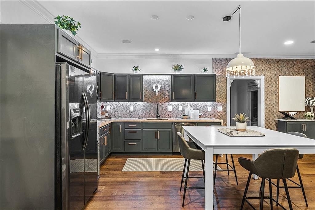 This kitchen features a sleek, modern design with matte dark gray cabinetry contrasted by warm wooden floors. The backsplash highlights a unique metallic tile pattern that adds texture and shine, reflecting the light from both recessed ceiling fixtures and a mid-century modern pendant lamp hanging above a white dining table. The table is surrounded by olive-colored, upholstered chairs with black metal legs, contributing to the overall contemporary yet cozy atmosphere. Stainless steel appliances blend seamlessly into the cabinetry, while small potted plants atop the cabinets bring subtle natural accents to the space.