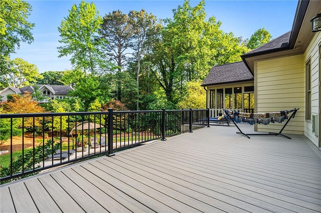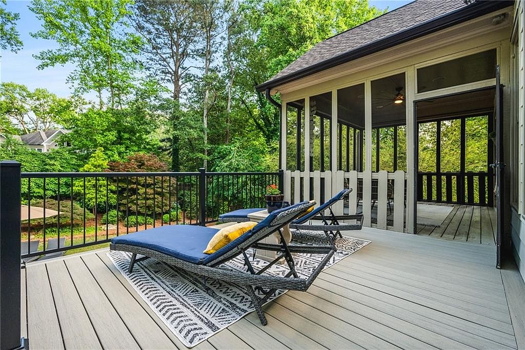 This spacious outdoor deck features durable, light gray composite decking complemented by a black metal railing that offers unobstructed views of lush, mature trees and landscaping beyond. Two dark wicker chaise lounges with navy blue cushions and a small side table sit atop a patterned black-and-white outdoor rug, creating a cozy seating area. Adjoining the deck is a screened porch with white framing and dark wood flooring, providing a sheltered space for outdoor enjoyment. The ceiling fan inside the porch adds comfort, blending contemporary and natural elements in a serene, inviting backyard retreat.