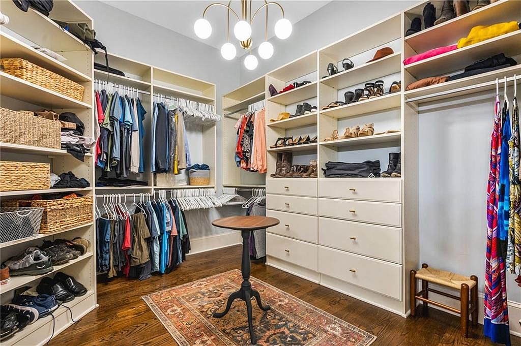 This spacious walk-in closet features an organized layout with built-in shelving units and drawers painted in a creamy off-white tone, creating a clean and bright atmosphere. Multiple hanging rods line the walls, holding a variety of neatly arranged clothing including shirts, pants, and dresses, while several open shelves display an extensive shoe collection and woven baskets for extra storage. The dark wooden floor contrasts warmly with the lighter cabinetry and supports a traditional patterned area rug. A small, round wooden table stands centrally beneath a modern gold chandelier with globe lights, adding a touch of elegance and functionality.