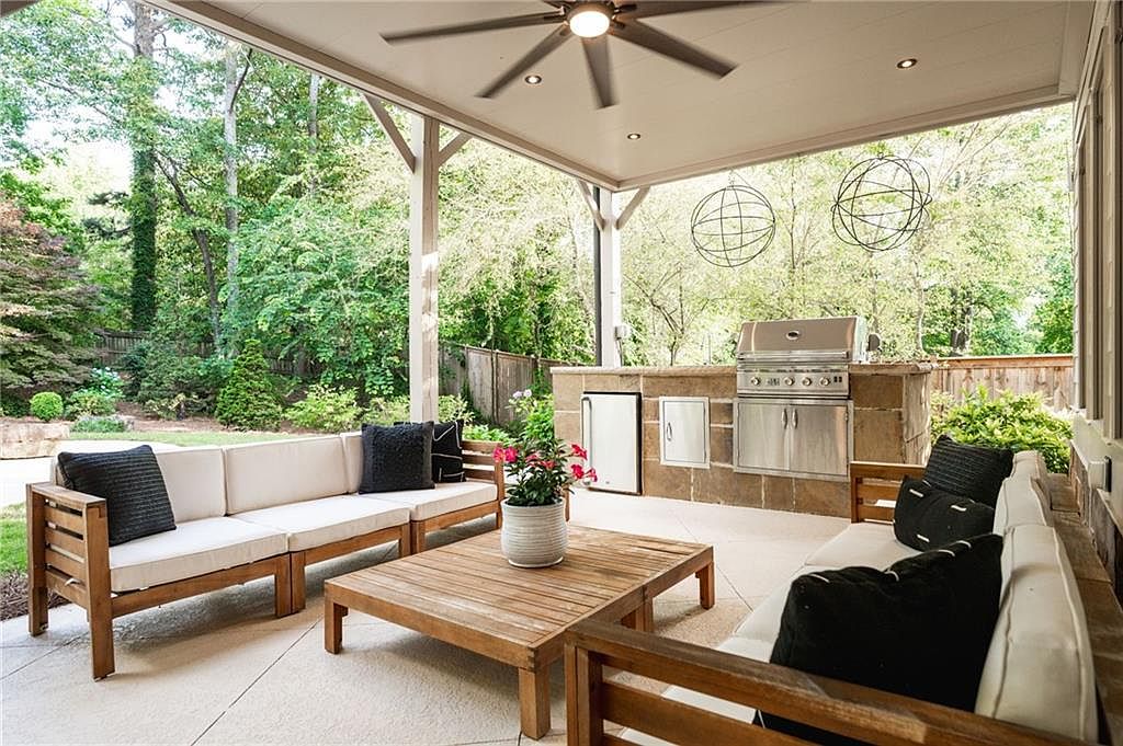This inviting covered patio features a cozy outdoor seating arrangement with wooden-framed sofas accented by soft, off-white cushions and contrasting black throw pillows. A large wooden coffee table anchors the space, topped with a small potted plant adding a touch of natural color. The backdrop includes a built-in stone grill and cabinetry with stainless steel elements, offering a functional outdoor kitchen area. Two artistic spherical light fixtures add modern flair to the ceiling. Surrounded by lush greenery and fenced for privacy, the neutral stone flooring and soft overhead lighting create an ideal space for relaxed entertaining.