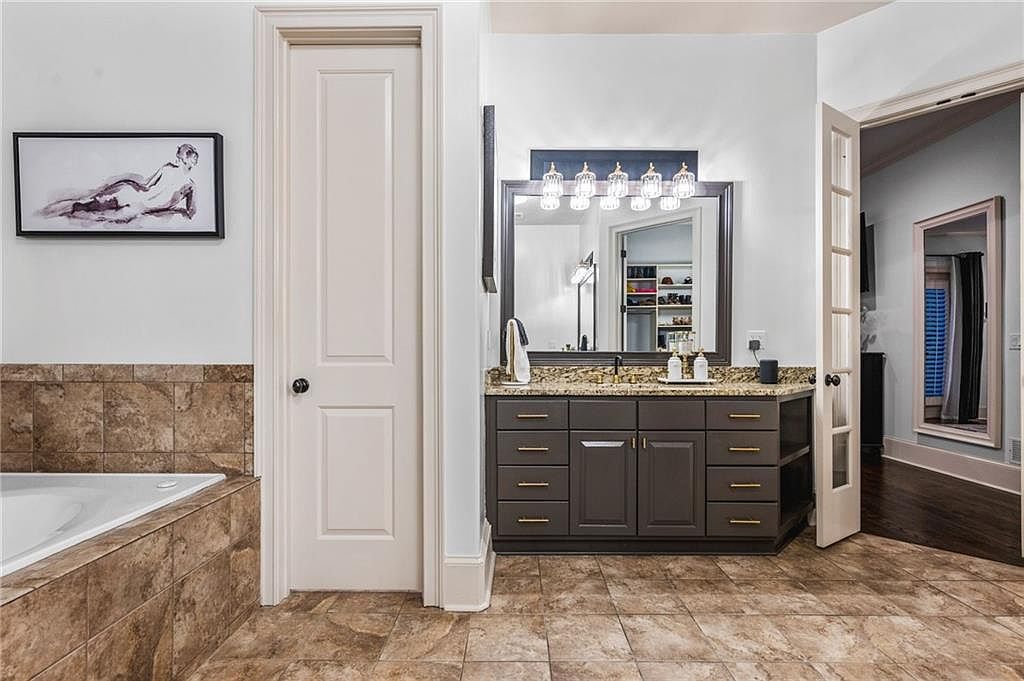 This bathroom section features a spacious vanity with dark cabinetry contrasted by a speckled granite countertop. The vanity includes several drawers and cupboards with sleek brass handles, providing ample storage. Above it, a large rectangular mirror is framed in black, illuminated by a row of five vintage-style glass light fixtures that add a warm glow. To the left, a partially visible bathtub is encased in natural stone tiles matching the floor’s earthy tone, creating continuity. White walls and simple baseboards add brightness while neutral, natural materials lend a classic, elegant feel to the space. A glimpse into an adjacent room shows dark wood flooring and a large wall mirror, enhancing the open, airy atmosphere.