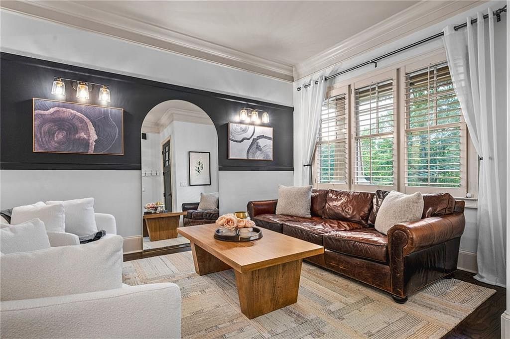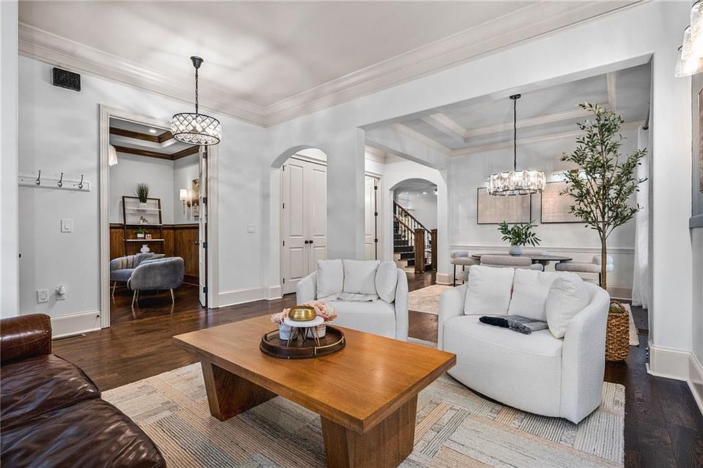 This bright living room features a harmonious blend of modern and classic design elements. The seating arrangement includes two plush white armchairs and a dark brown leather sofa, centered around a solid wood coffee table with clean lines. Soft, neutral tones dominate the space, accented by the warm, rich hue of the dark hardwood floors. Architectural interest is added through crown molding and paneled doorways with rounded arches. The room transitions seamlessly into adjacent seating and dining areas, each illuminated by contemporary pendant lights and highlighted by simple yet elegant decor, including a tall indoor plant for added greenery.