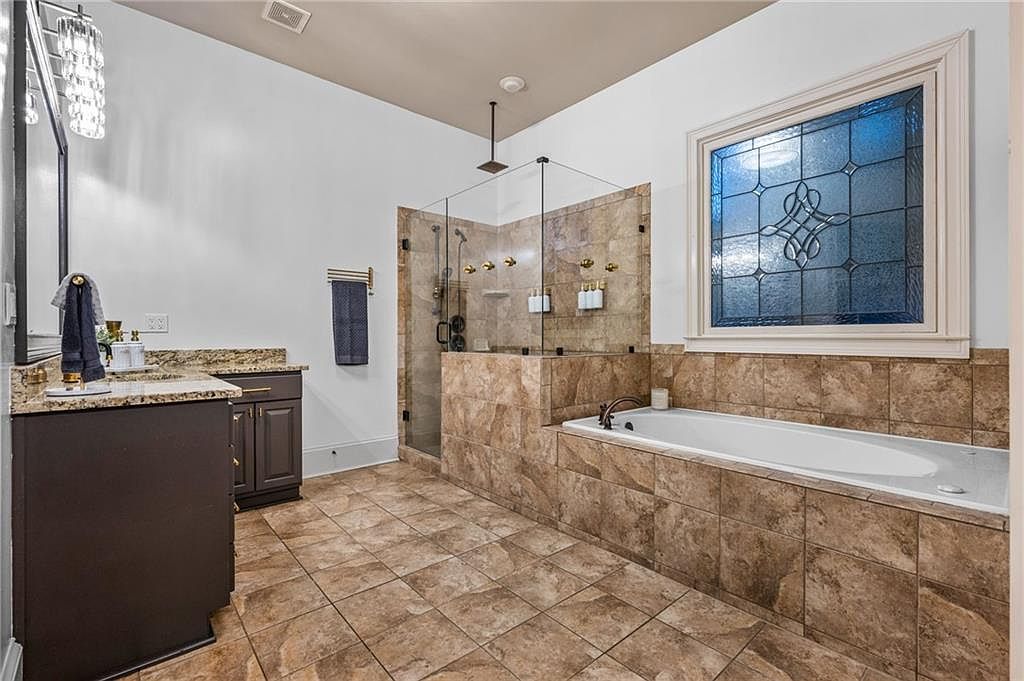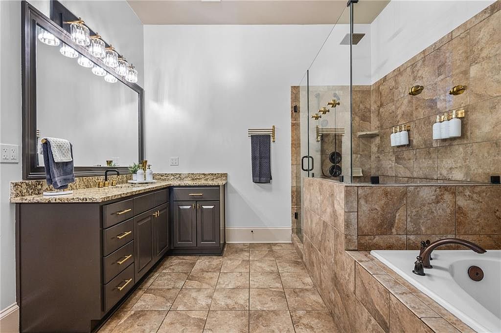 This master bathroom features a spacious layout with warm, earth-toned tile flooring that extends seamlessly into the walk-in shower and tub surround, creating a cohesive look. The double vanity is fitted with dark cabinetry accented by sleek brass handles and topped with a granite countertop, adding texture and elegance. Above the vanity, a large framed mirror reflects the bright overhead lighting fixtures composed of multiple globe bulbs. White walls provide a clean backdrop, while gold-finished fixtures throughout the shower and towel rack complement the overall warm and inviting aesthetic.