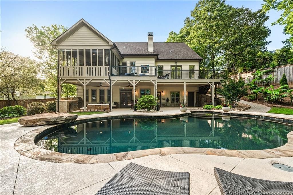 This expansive backyard offers a serene and private outdoor living space centered around a kidney-shaped pool with a surrounding concrete deck. The pool is flanked by several lounge chairs and a large, offset umbrella for shade, perfect for both relaxation and socializing. The two-story home features a screened-in porch on the upper level and covered patio underneath, supported by simple yet sturdy white columns. The house’s exterior is painted in a soft gray with white trim, complemented by black railings along the balcony, blending modern and traditional aesthetics. Mature trees and lush greenery frame the yard, creating a tranquil setting.