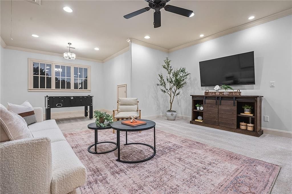 This spacious game and media room features a clean and minimalist layout, designed for relaxation and entertainment. The neutral palette of white walls and light gray carpet sets a calm tone, complemented by the warm wood finish of the TV console. A large flat-screen TV is mounted above the console, creating a focal point for movie nights. Two round black metal coffee tables with simple lines rest on a muted pink and mauve rug that adds subtle color and texture. Seating includes a white textured sofa with neutral-toned throw pillows and a modern cushioned lounge chair. A foosball table near the window suggests a playful atmosphere. The recessed ceiling lights and black ceiling fan provide functional illumination and ventilation. A tall potted plant in the corner adds a touch of greenery, enhancing the room’s inviting aesthetic.