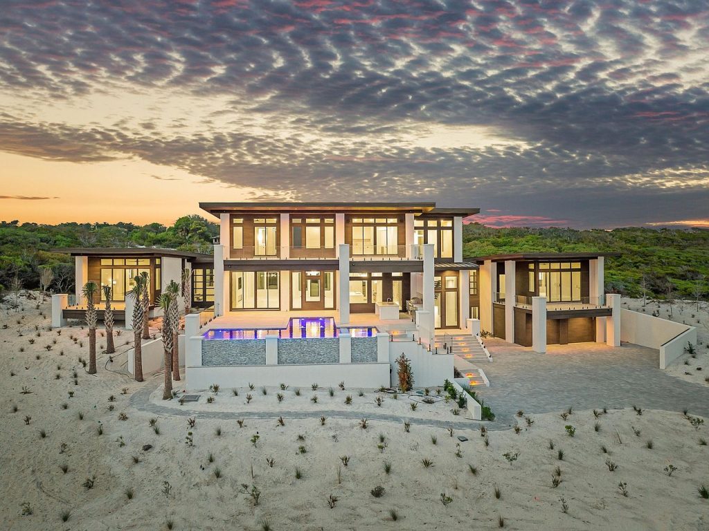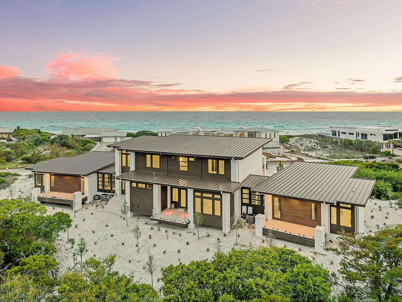 This stunning coastal home features a modern two-story design with clean lines and a blend of natural and contemporary materials. The exterior combines a sleek dark wood finish with light stucco accents, creating a warm yet sophisticated look. Metal roofing adds durability and a minimalist aesthetic. Expansive glass windows and doors allow natural light to fill the interior while offering panoramic views of the ocean. The property is surrounded by native coastal sand dunes and natural greenery, giving a seamless connection between the residence and its serene beachside environment. The sunset sky enhances the peaceful atmosphere.