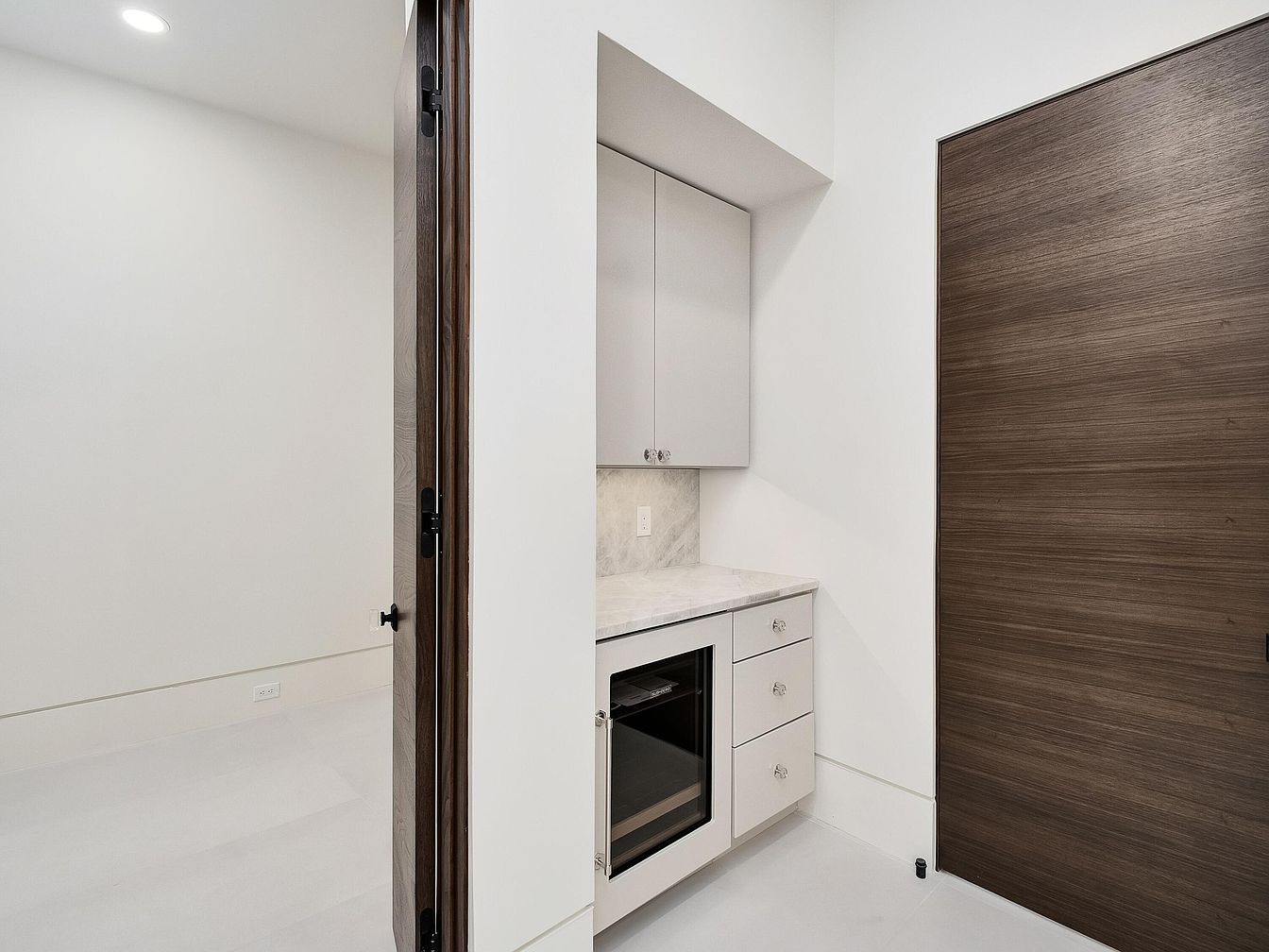 This compact butler’s pantry nook features a sleek and minimalist design with clean white walls and cabinetry. The cabinetry is arranged in an alcove with upper and lower storage, including a built-in small beverage refrigerator with a glass door. The countertop appears to be a polished marble or quartz surface, accented with a subtle matching backsplash. The cabinetry knobs are crystal or glass, adding a delicate touch of elegance. The space is framed by two wood doors with a rich, medium-dark stain that introduces warmth and contrast to the otherwise monochromatic area, enhancing the modern and efficient feel.