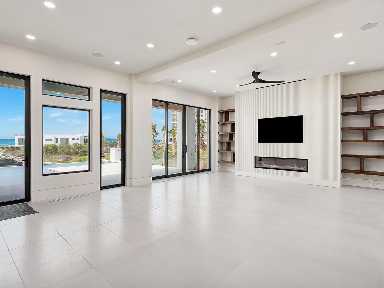 This spacious living area features a contemporary design with large, light-colored floor tiles that enhance the airy feel. Floor-to-ceiling glass doors and windows frame stunning ocean views, allowing natural light to flood the room. A sleek built-in entertainment wall incorporates a modern linear fireplace beneath a mounted flat-screen TV, framed by textured vertical paneling in a soft white tone. Flanking the fireplace are wooden open shelving units that add warmth and balance to the minimalist decor. Recessed lighting and a black ceiling fan contribute to the room’s clean, sophisticated aesthetics and functionality.