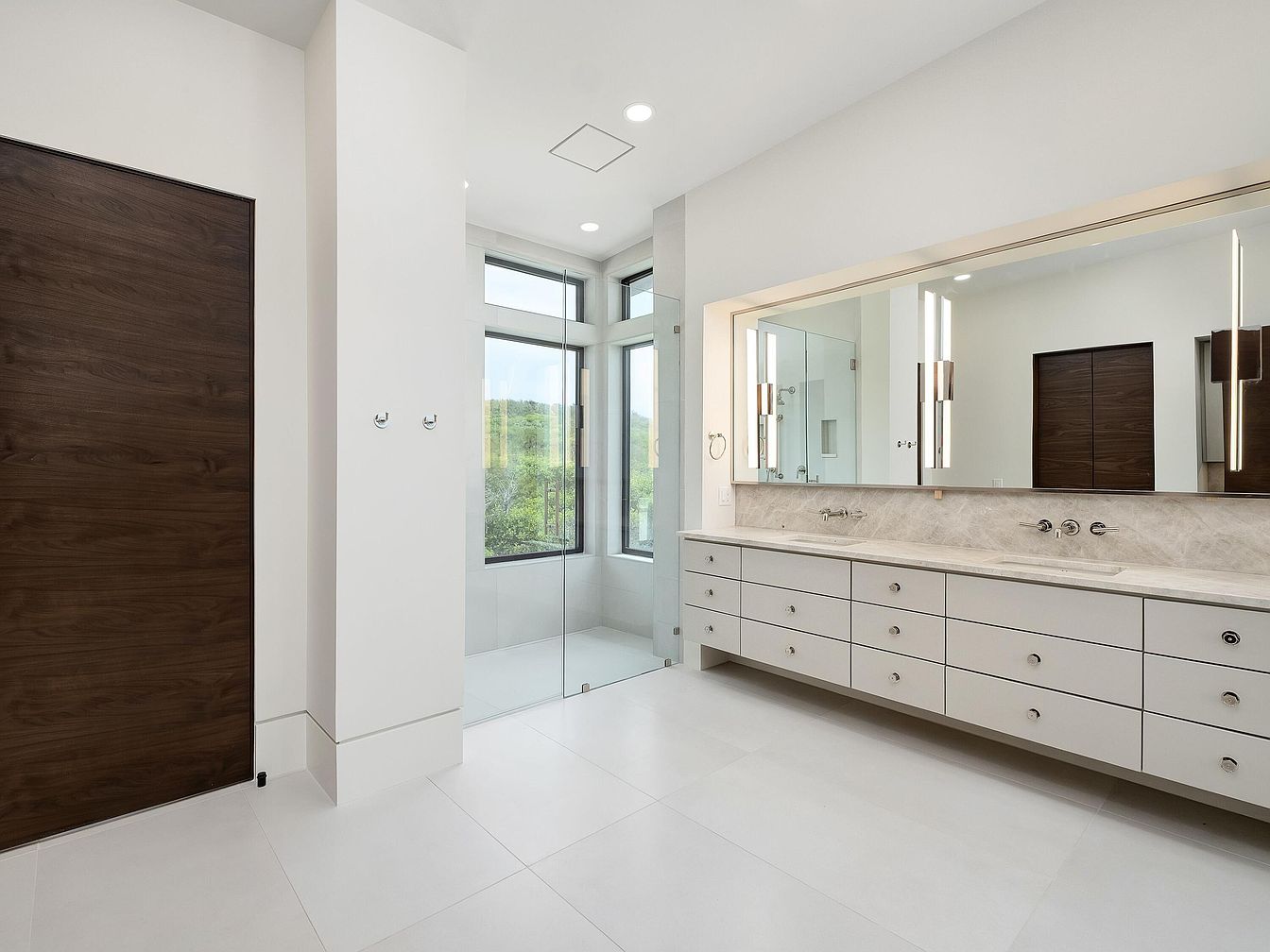 This master bathroom features a sleek, modern design with a neutral color palette dominated by whites and soft grays. The floating vanity offers ample storage with multiple drawers and a smooth marble countertop, accented by dual under-mount sinks and wall-mounted faucets. Above the vanity, a large horizontal mirror is flanked by minimalist vertical light fixtures, providing ambient and task lighting. The walk-in shower is enclosed by frameless glass, allowing natural light from the expansive corner windows to fill the space, highlighting a serene view of greenery outside. The dark wood door adds contrast and warmth to the clean, contemporary space.