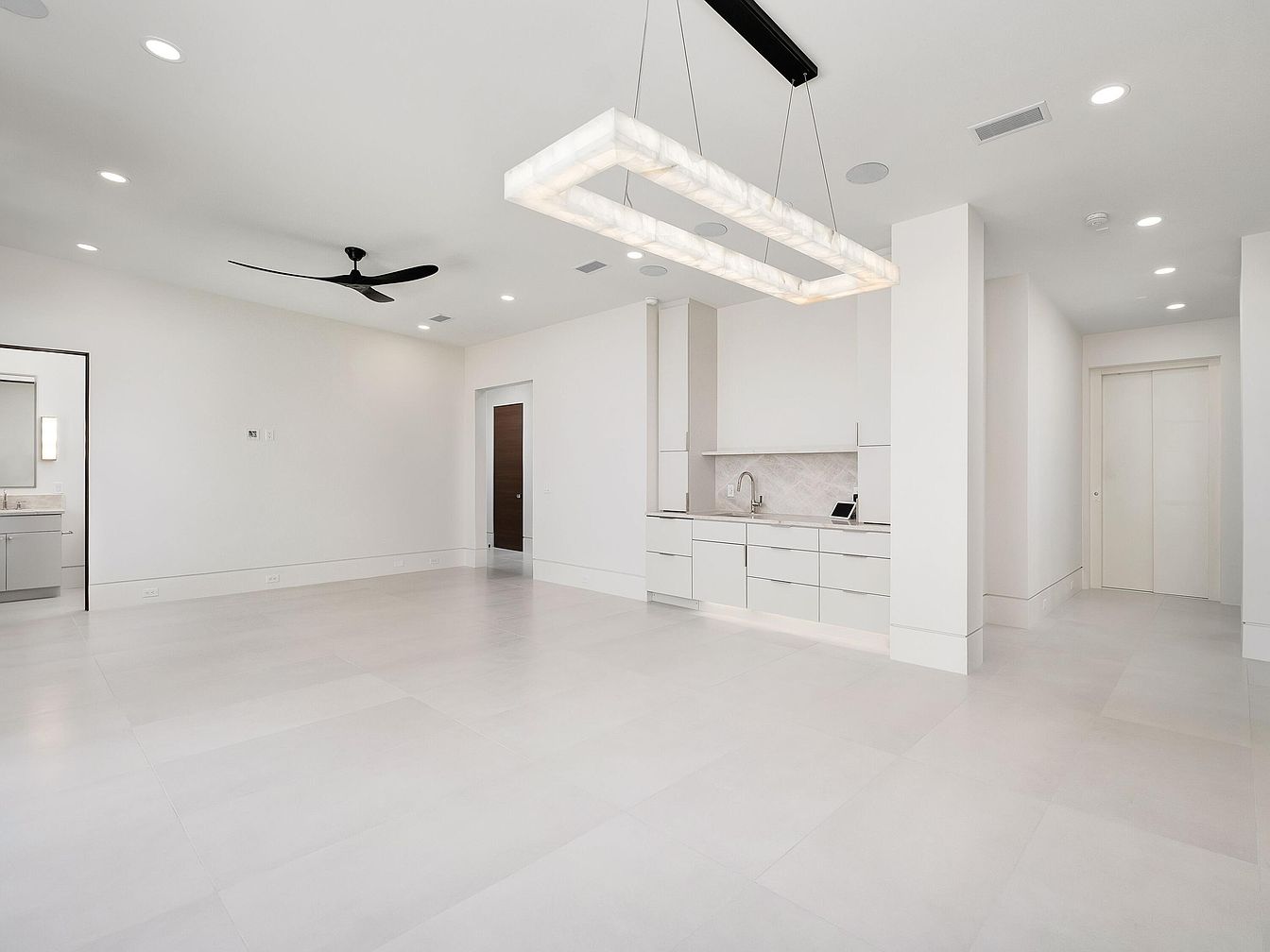 This spacious and minimally styled room likely serves as a combined kitchen and dining area. It features sleek white cabinetry with handle-less drawers and a matching countertop integrated against one wall. A built-in sink and modern faucet are positioned centrally beneath two tall cabinetry units. The room’s palette is predominantly white, enhancing brightness alongside the large, light-colored floor tiles. A statement rectangular light fixture with a soft, diffused glow hangs above, while a black minimalist ceiling fan adds contrast and functionality. Recessed ceiling lights provide additional illumination. Multiple doorways lead to adjacent spaces, emphasizing open and fluid connectivity within the home.