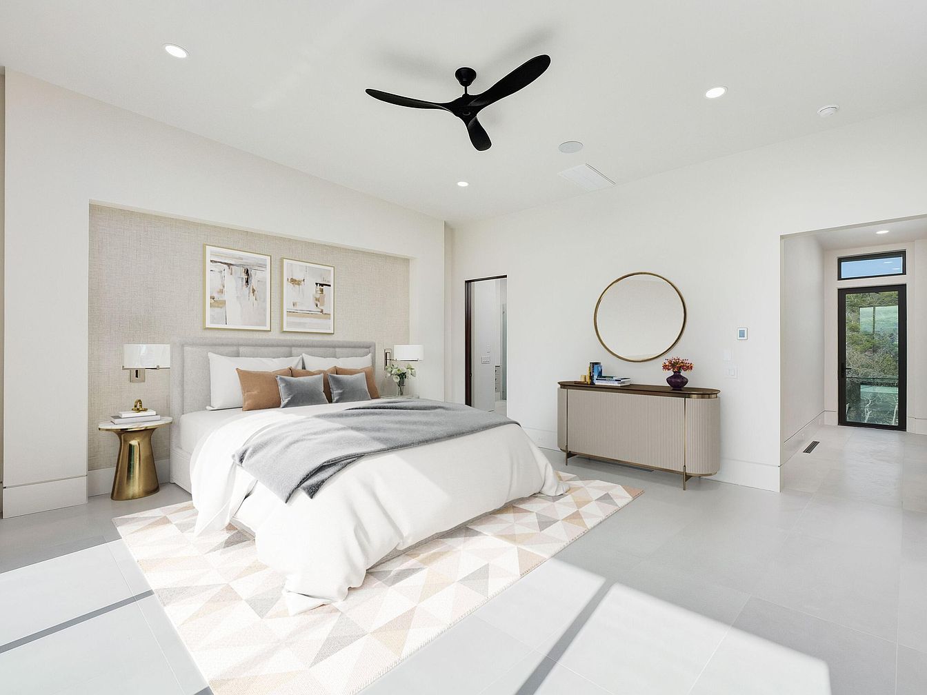 This master bedroom features a minimalist and airy design with a neutral color palette dominated by soft whites, beige, and subtle gray tones. The bed, centered against a textured accent wall, is dressed in crisp white linens with brown and gray throw pillows adding warmth. A modern brass-finished side table with a white lamp complements the decor. Opposite the bed, a sleek, ribbed dresser in taupe holds a round, gold-framed mirror and decor pieces. The large-format white tile flooring is softened by a geometric pastel area rug. Floor-to-ceiling windows allow natural light to flood the space, enhancing the clean, sophisticated ambiance. A black ceiling fan adds contrast and functionality, while an open doorway leads to an adjacent corridor, hinting at connected private spaces.