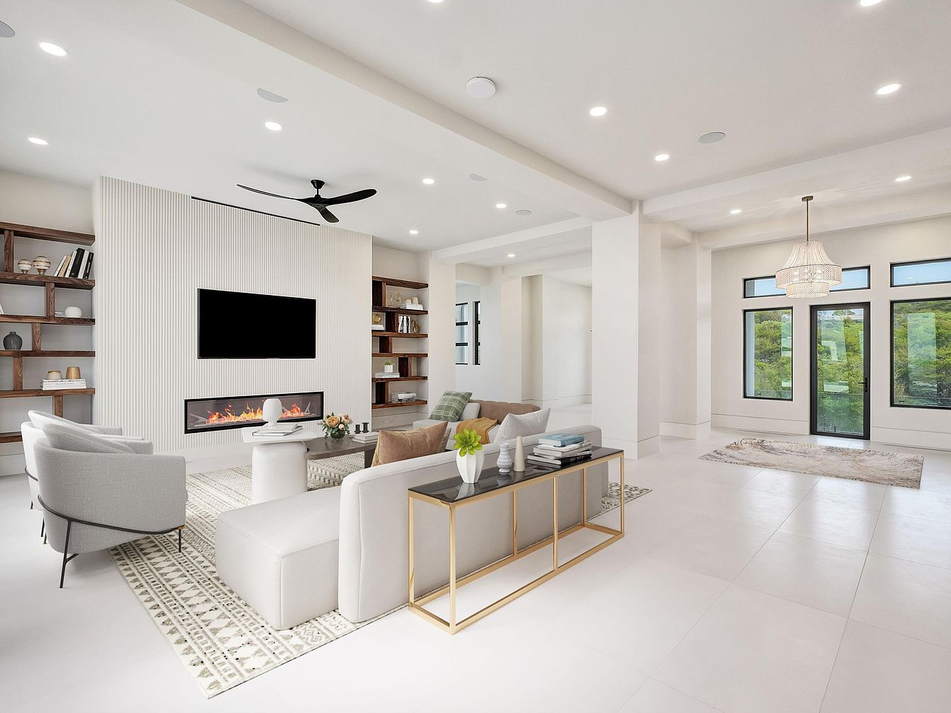 This modern living room is designed with a bright, airy ambiance accentuated by a neutral color palette dominated by whites and soft grays. The layout centers around a sleek, wall-mounted flat screen TV above a linear fireplace embedded in a vertically grooved white feature wall. Flanking the fireplace, built-in wooden shelves add warmth and subtle contrast, showcasing minimalistic decor items. The furniture includes a large sectional sofa and two curved armchairs arranged on a patterned area rug, perfect for conversation. The gold-accented console table behind the sofa holds plants and books, introducing elegance. Recessed lighting and a sculptural black ceiling fan enhance the clean, sophisticated atmosphere, while a crystal chandelier hangs by the glass doors, inviting natural light and scenic views inside.