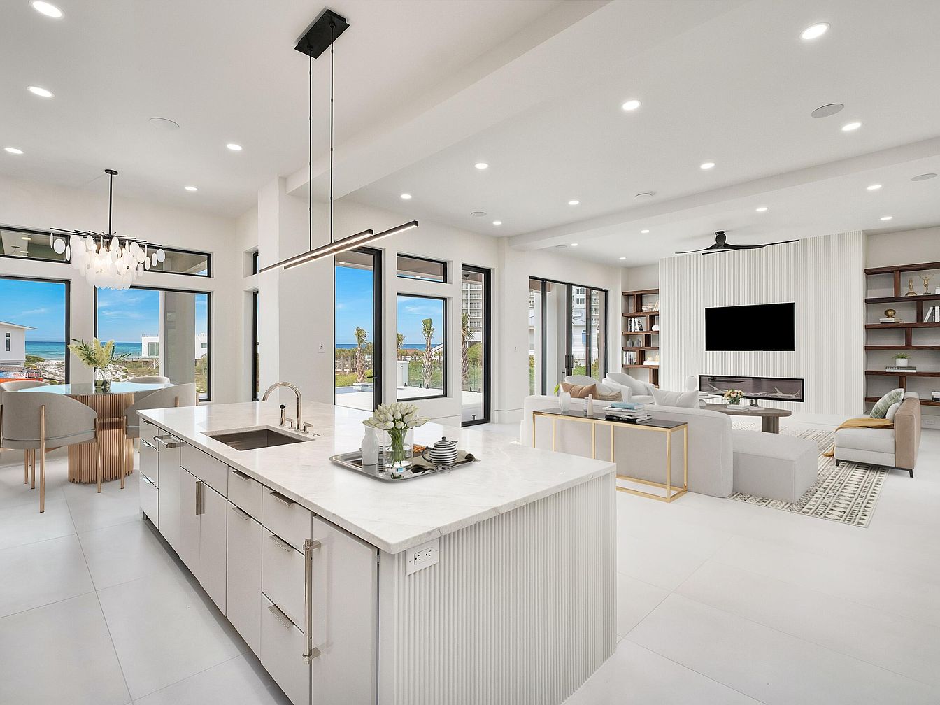 The space seamlessly blends a modern kitchen with a spacious living room, emphasizing openness and natural light. The kitchen features a large, sleek island with a white marble countertop and integrated sink, complemented by minimalist cabinetry in light neutral tones. Above the island, a contemporary linear pendant light adds sophistication. Floor-to-ceiling windows around the perimeter frame ocean views, flooding the room with light while connecting indoor and outdoor spaces. The living area includes plush sofas in muted colors, built-in wooden shelving flanking a stylish, vertical-paneled white fireplace wall, and a ceiling fan above, creating a calming, airy atmosphere.