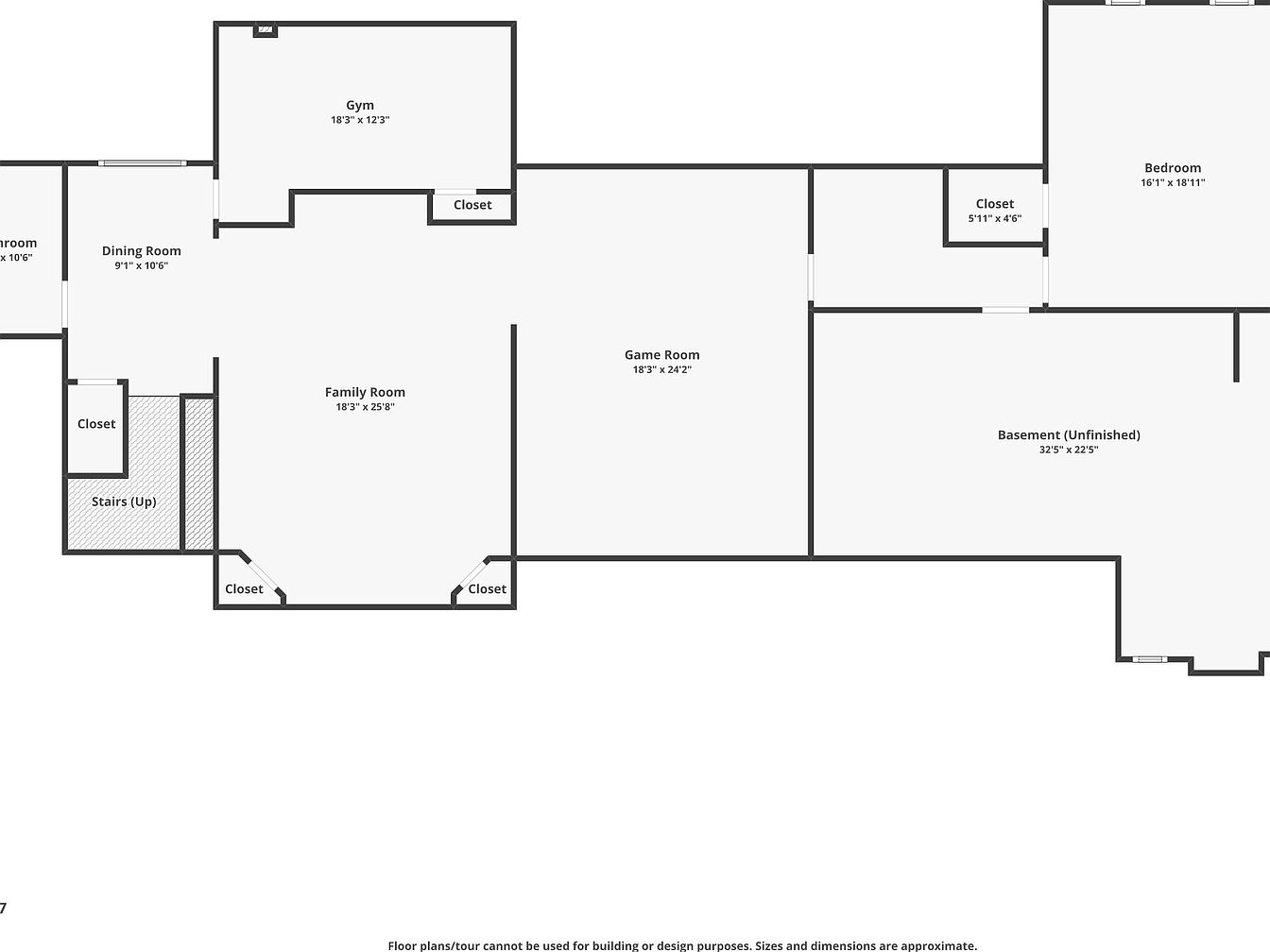 This basement layout offers a versatile living space with distinct zones catering to fitness, leisure, and storage. The design features a large Family Room measuring 18’3″ by 25’8″, flanked by two closets ideal for organization. Adjacent is a spacious Game Room at 18’3″ by 24’2″, perfect for recreation or entertainment. A dedicated Gym area spans 18’3″ by 12’3″ and includes its own closet for workout essentials. The plan includes a sizable unfinished Basement section, 32’5″ by 22’5″, offering flexible customization options. A bedroom with a closet and a dining room complete the functional basement environment.