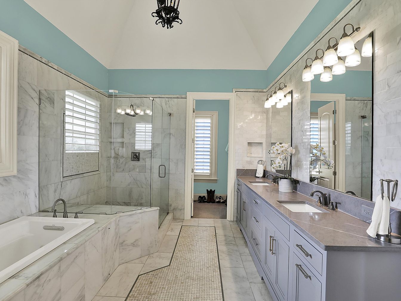 This spacious master bathroom features a harmonious blend of marble and soft blue tones, evoking a serene and luxurious atmosphere. The walk-in shower and bathtub are elegantly clad in white marble, seamlessly extending to the floor, while a textured mosaic tile runner adds visual interest to the pathway. The vanity offers dual sinks set in a sleek gray countertop atop powder blue cabinetry, complemented by large mirrors and bright, classic light fixtures. The high, vaulted ceiling and large window with white plantation shutters enhance natural light and a sense of openness, making this bathroom both functional and tranquil.