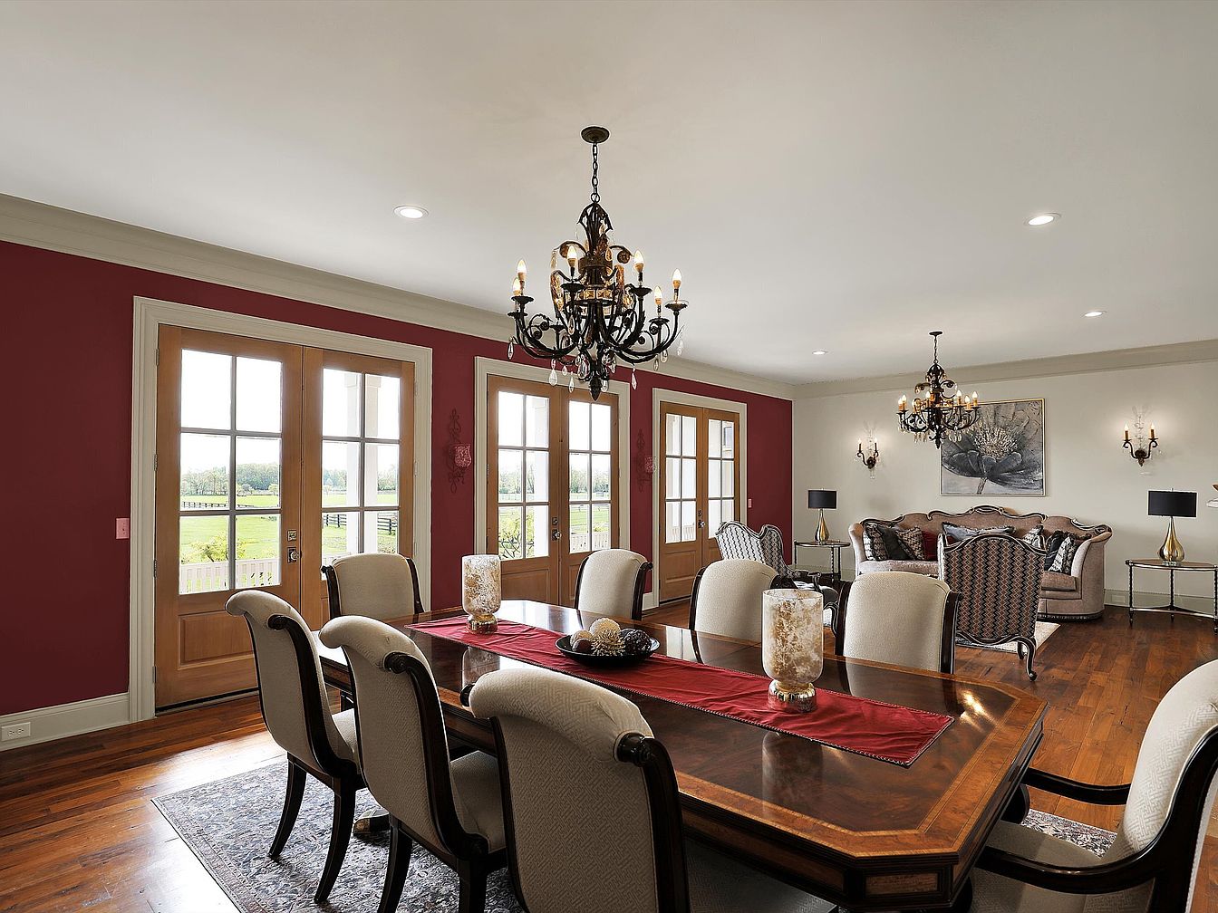 This elegant dining and living area features a rich, warm palette with deep red accent walls complementing the light beige trim and ceiling. The dining table, crafted from fine wood with intricate inlays, is surrounded by plush upholstered chairs in a soft cream fabric, centered on a subtle patterned rug. Large French doors along the red wall flood the room with natural light and offer access to an outdoor space, while two ornate black chandeliers with candle-style bulbs add a sophisticated touch. The adjacent living area showcases a curved beige sofa with coordinating armchairs and classic side tables, highlighted by framed artwork and symmetrical wall sconces that create a balanced and refined atmosphere.