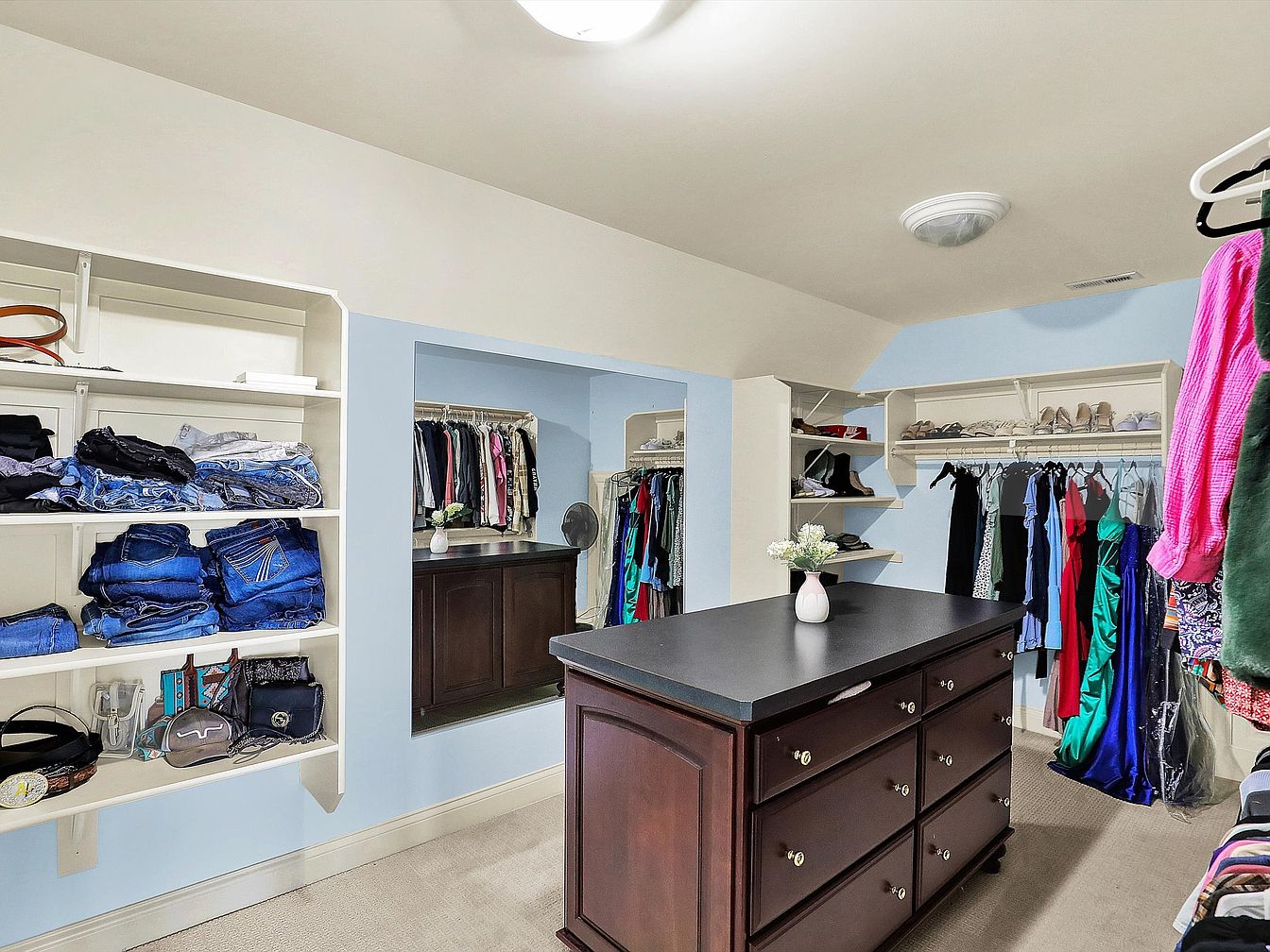 This walk-in closet features soft blue walls accented by white shelving, creating a fresh and calm atmosphere. Open shelves and hanging rods provide ample storage space for folded jeans, handbags, and a variety of dresses and pants. A dark wood island with multiple drawers stands centrally on a beige carpet, offering additional organization and a polished contrast to the lighter colors in the room. The space is illuminated by ceiling-mounted fixtures, and a large mirror integrated into the wall helps visually expand the room while serving a practical purpose. Simple, functional, and inviting.